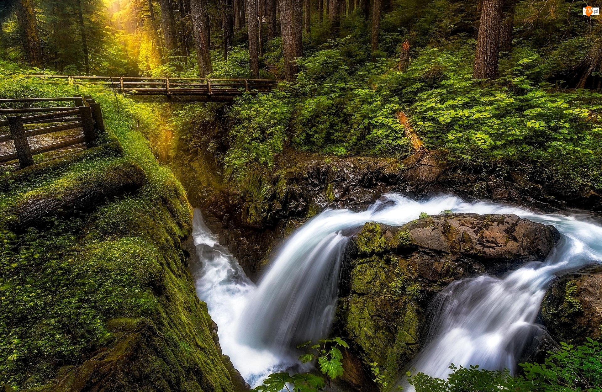 Wodospad, Las, Rośliny, Mostek, Rzeczka, Skały