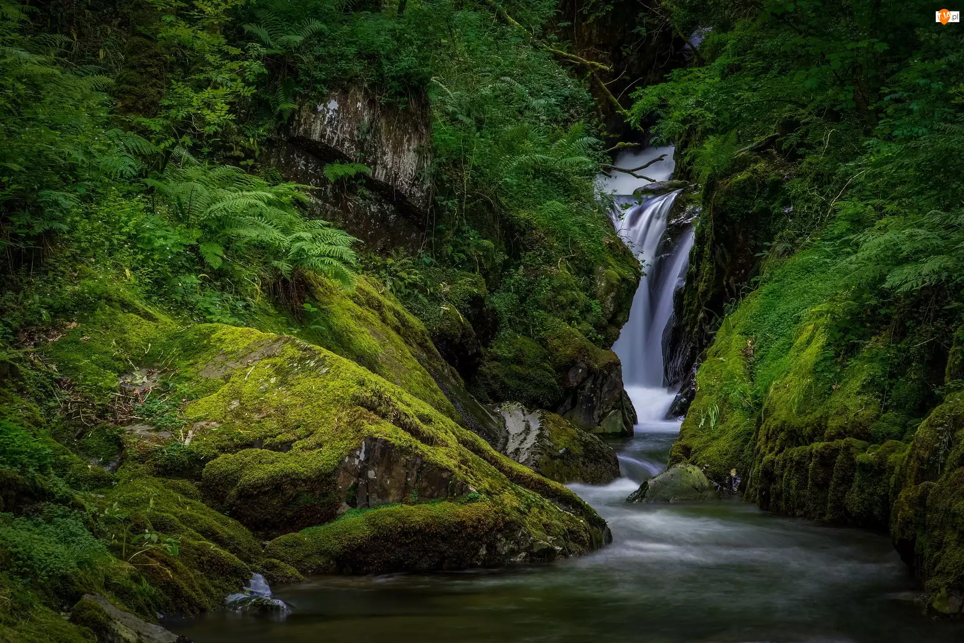 Wodospad na omszałych głazach