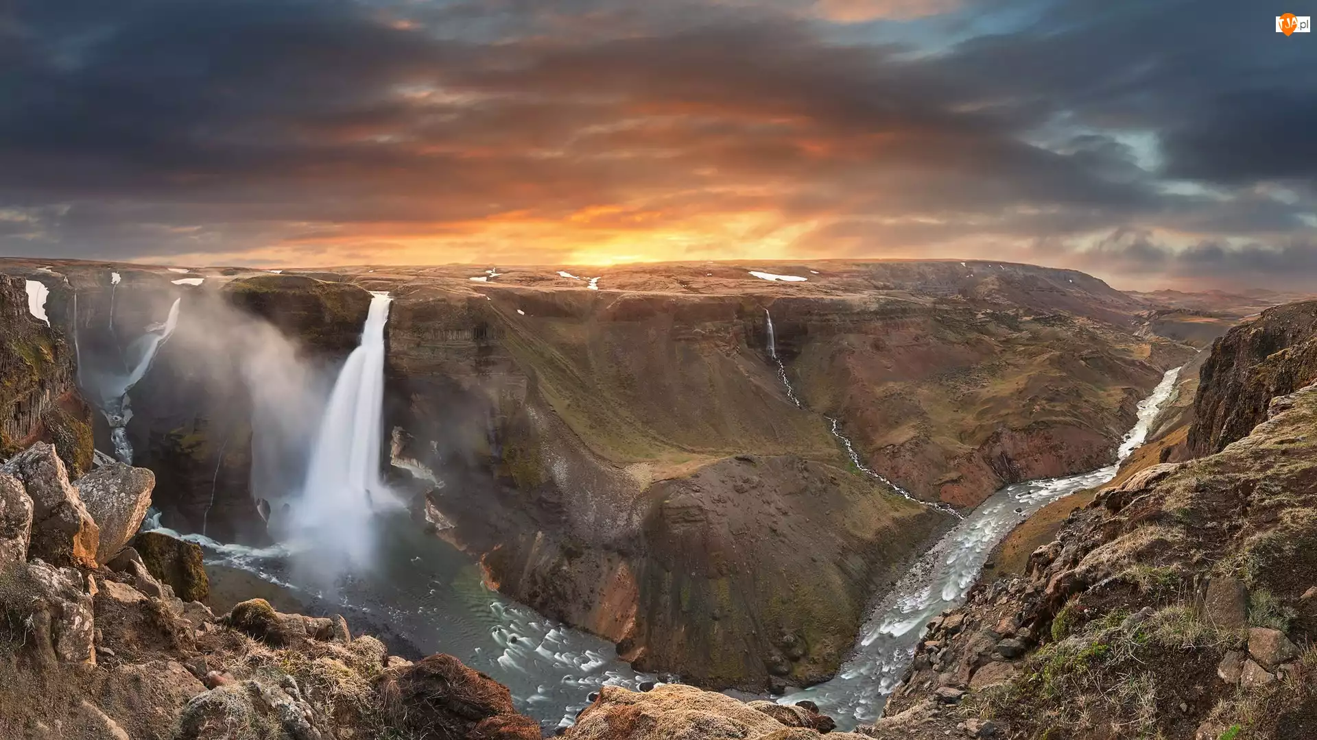 Wodospad, Chmury, Rzeka, Zachód słońca