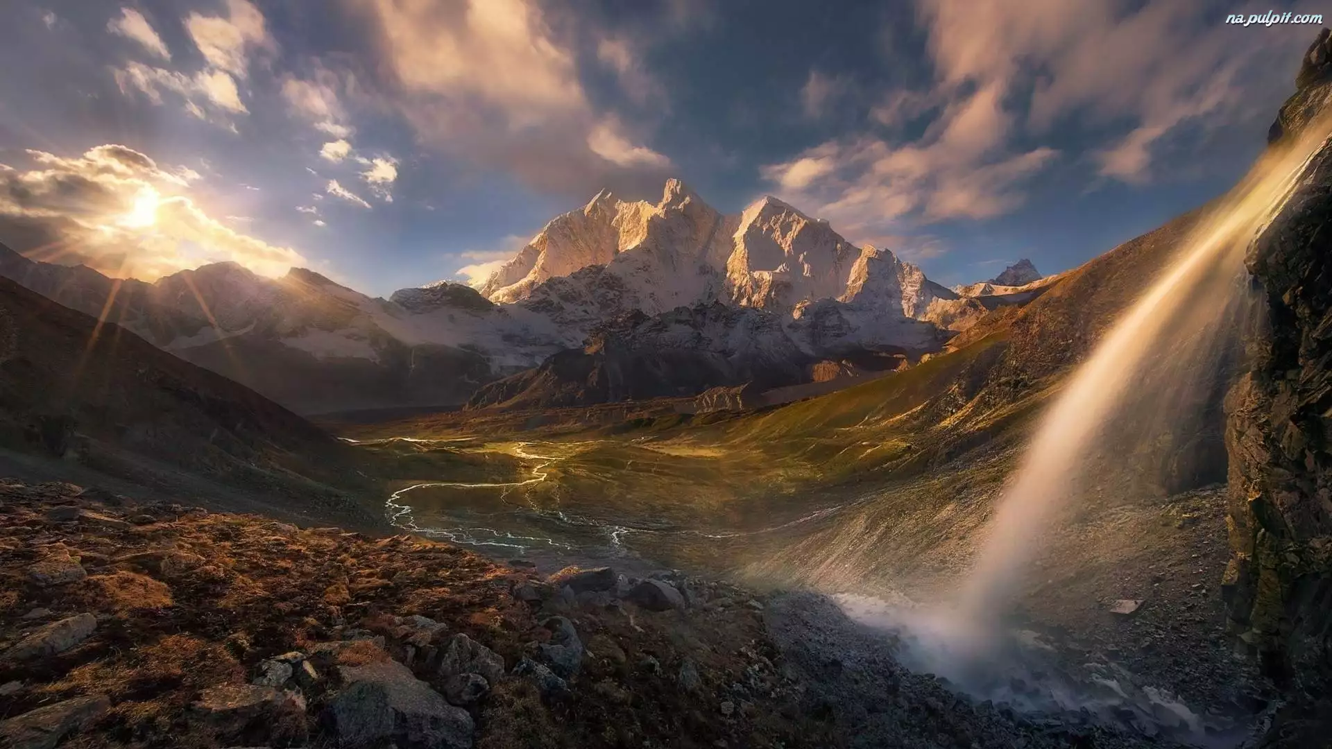 Wodospad, Słońce, Chiny, Góry Himalaje, Tybet, Rzeka, Skały