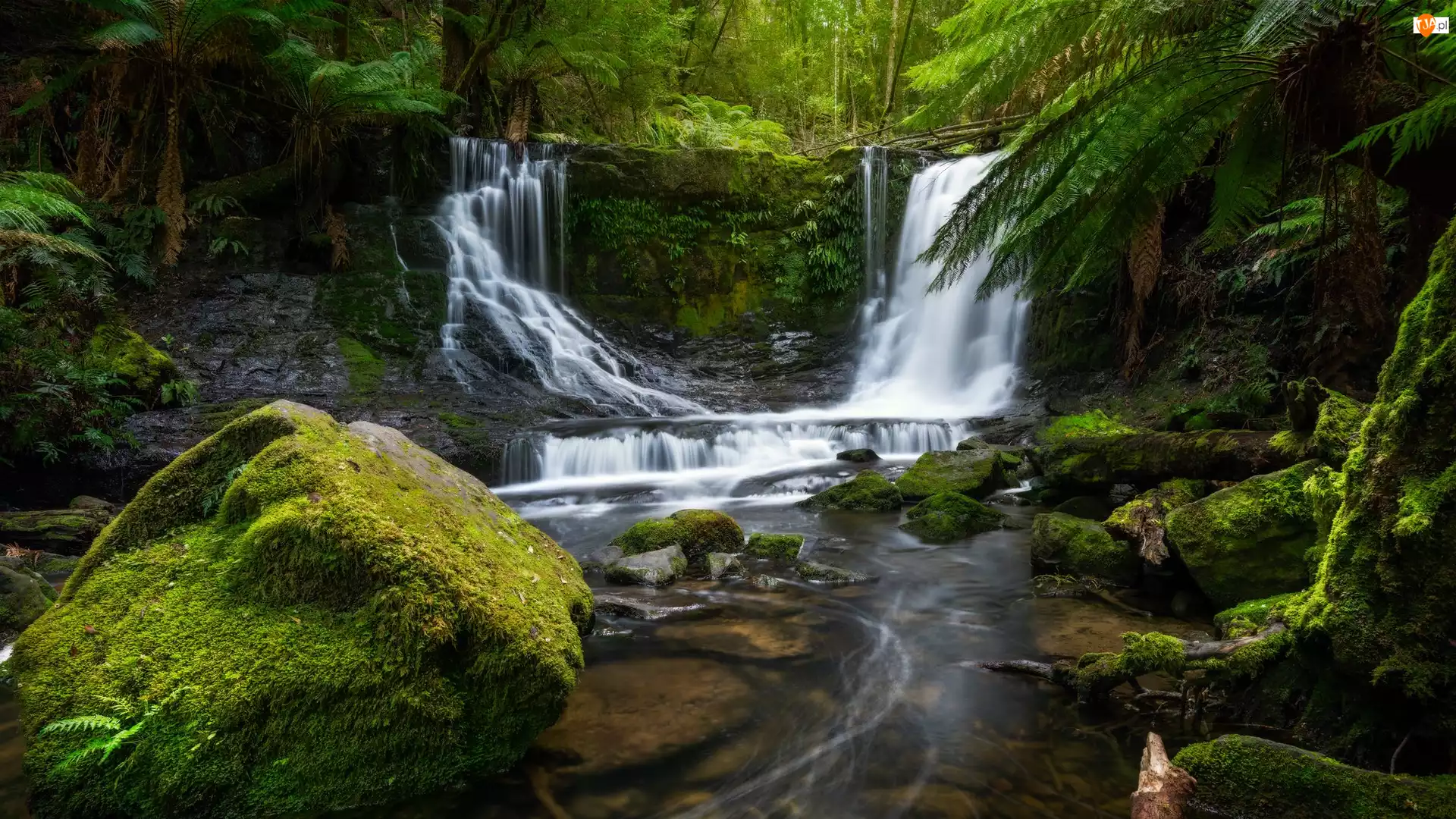 Australia, Rzeka, Park Narodowy Mount Field, Las, Skała, Wodospad Horseshoe Falls, Kamienie, Omszałe, Paprocie, Stan Tasmania
