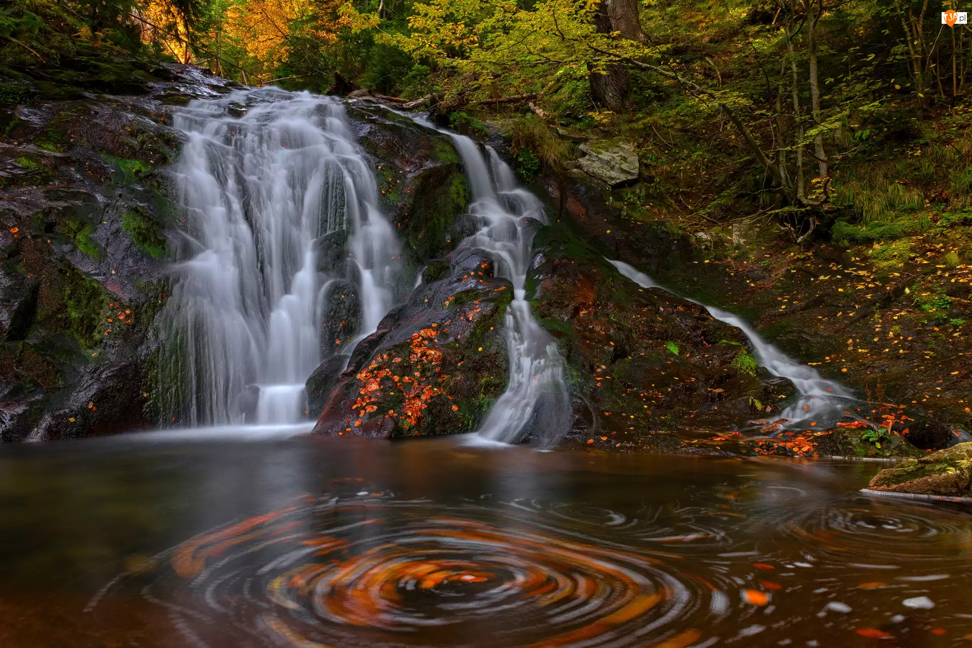 Skały, Jesień, Wodospad, Liście, Drzewa, Rzeka