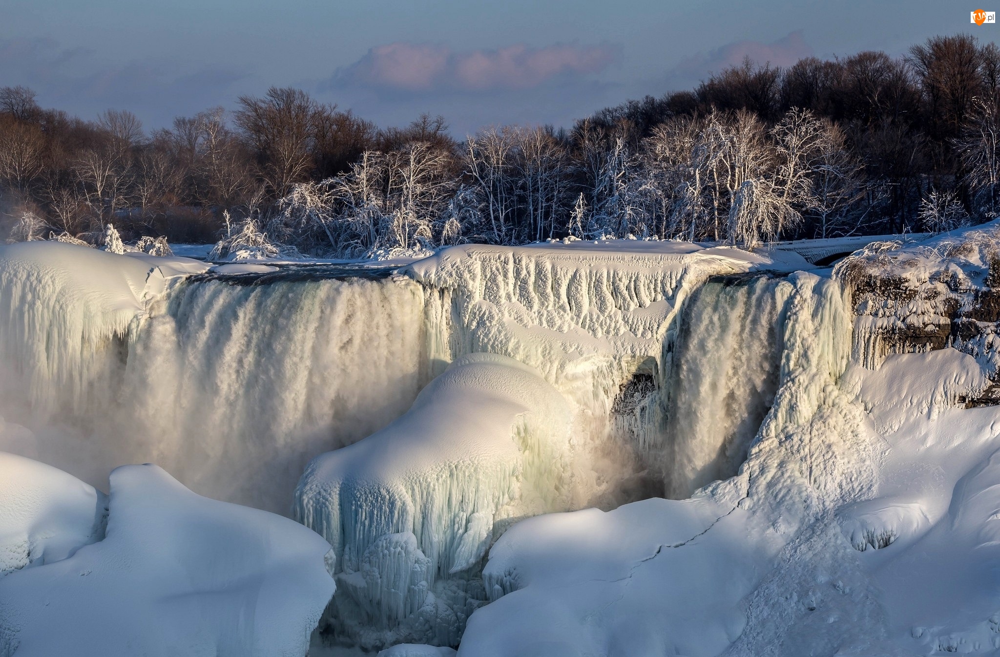 Wodospad, Zima, Rzeka, Drzewa, Zamarznięty
