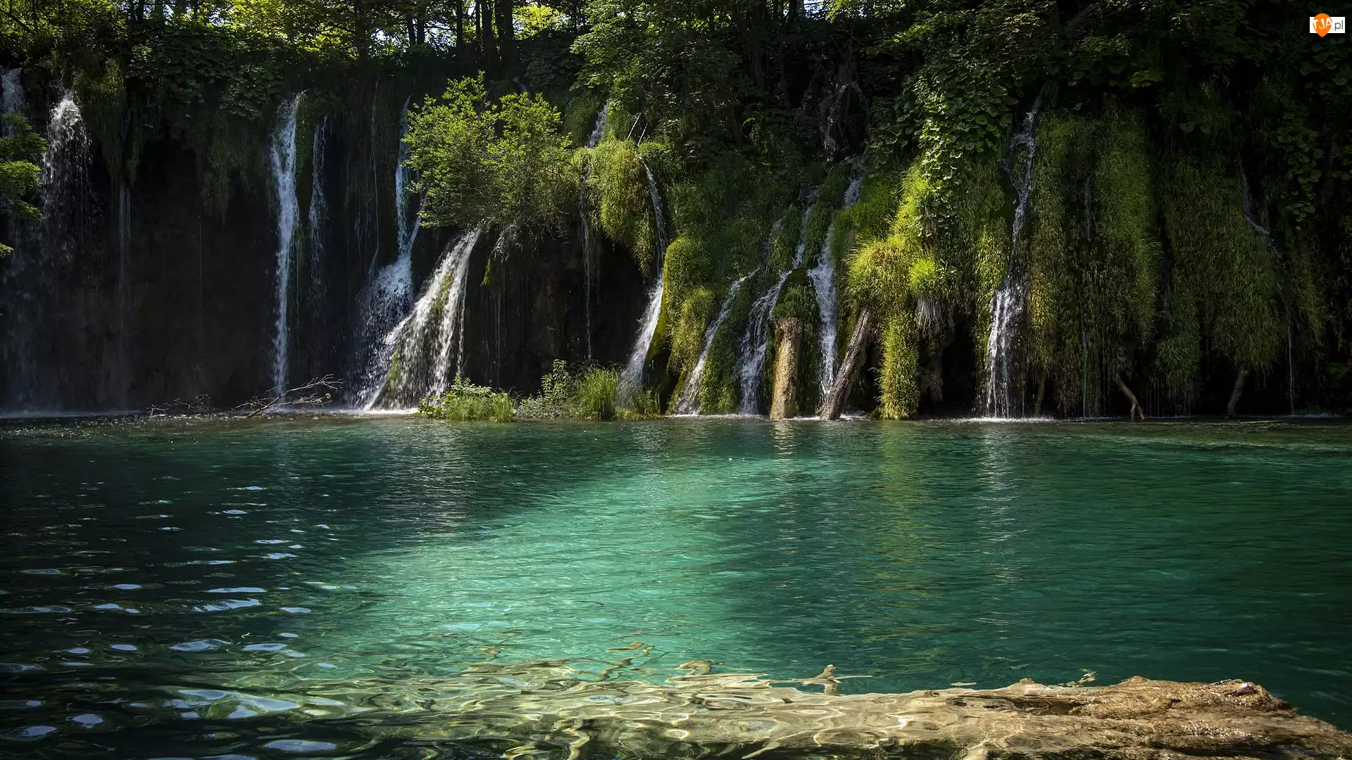 Jezioro, Chorwacja, Wodospady, Park Narodowy Jezior Plitwickich, Drzewa, Roślinność