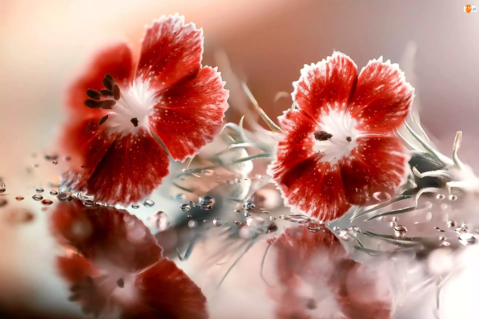 Wody, Szkło, Białe, Czerwono, Odbicie, Kwiaty, Krople