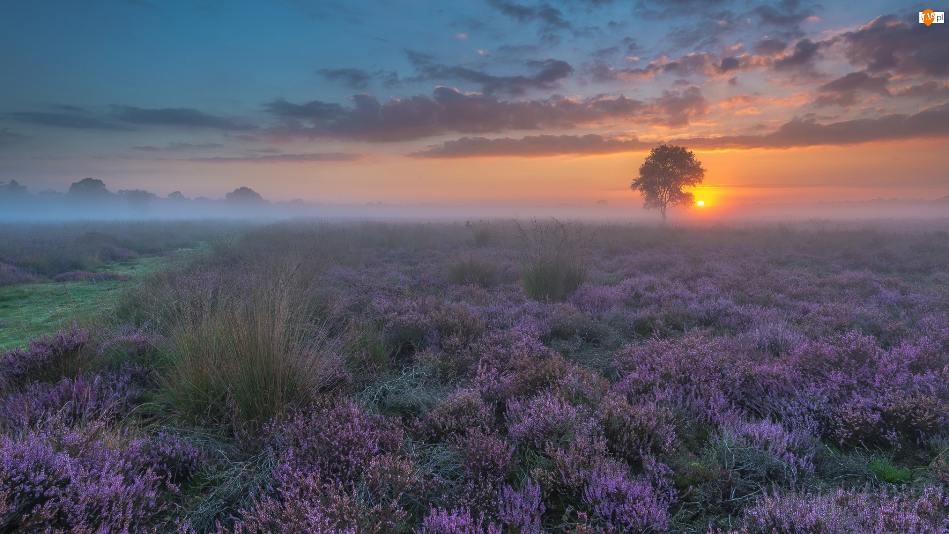Wrzosowisko, Wschód, Mgła, Słońca, Drzewo