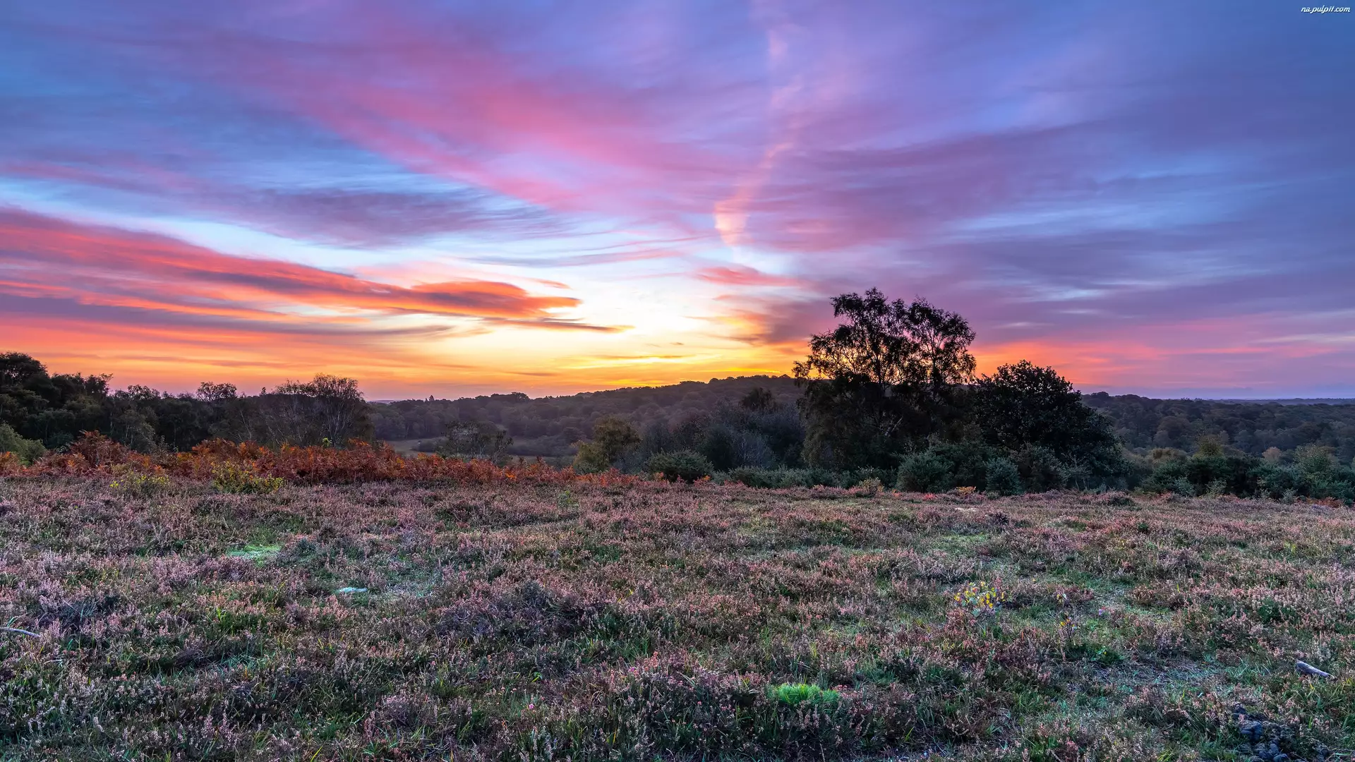Drzewa, Zachód słońca, Wrzosowisko, Pole, Chmury