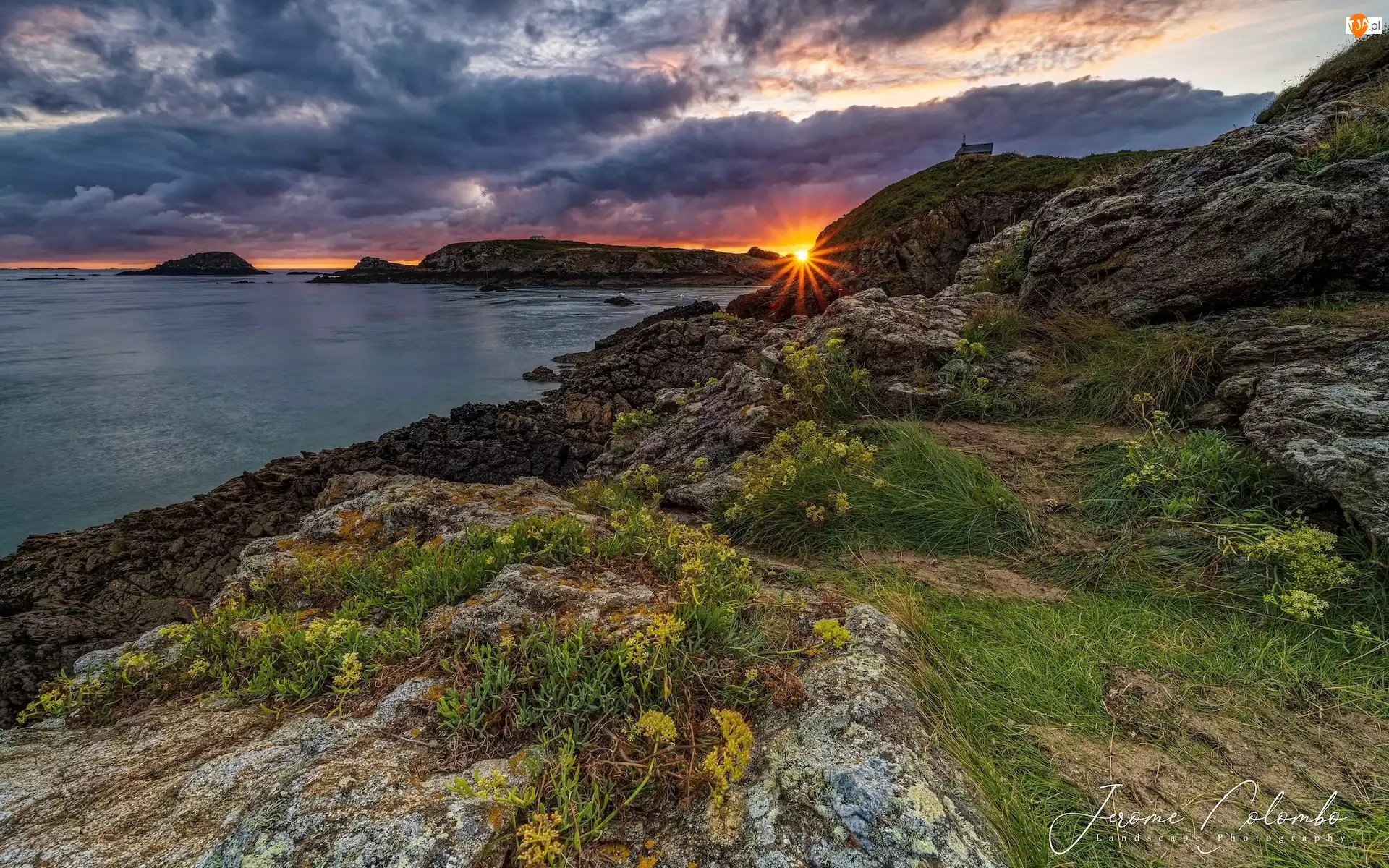 Wschód słońca, Francja, Wybrzeże, Chmury, Bretania, Skały, Roślinność, Morze