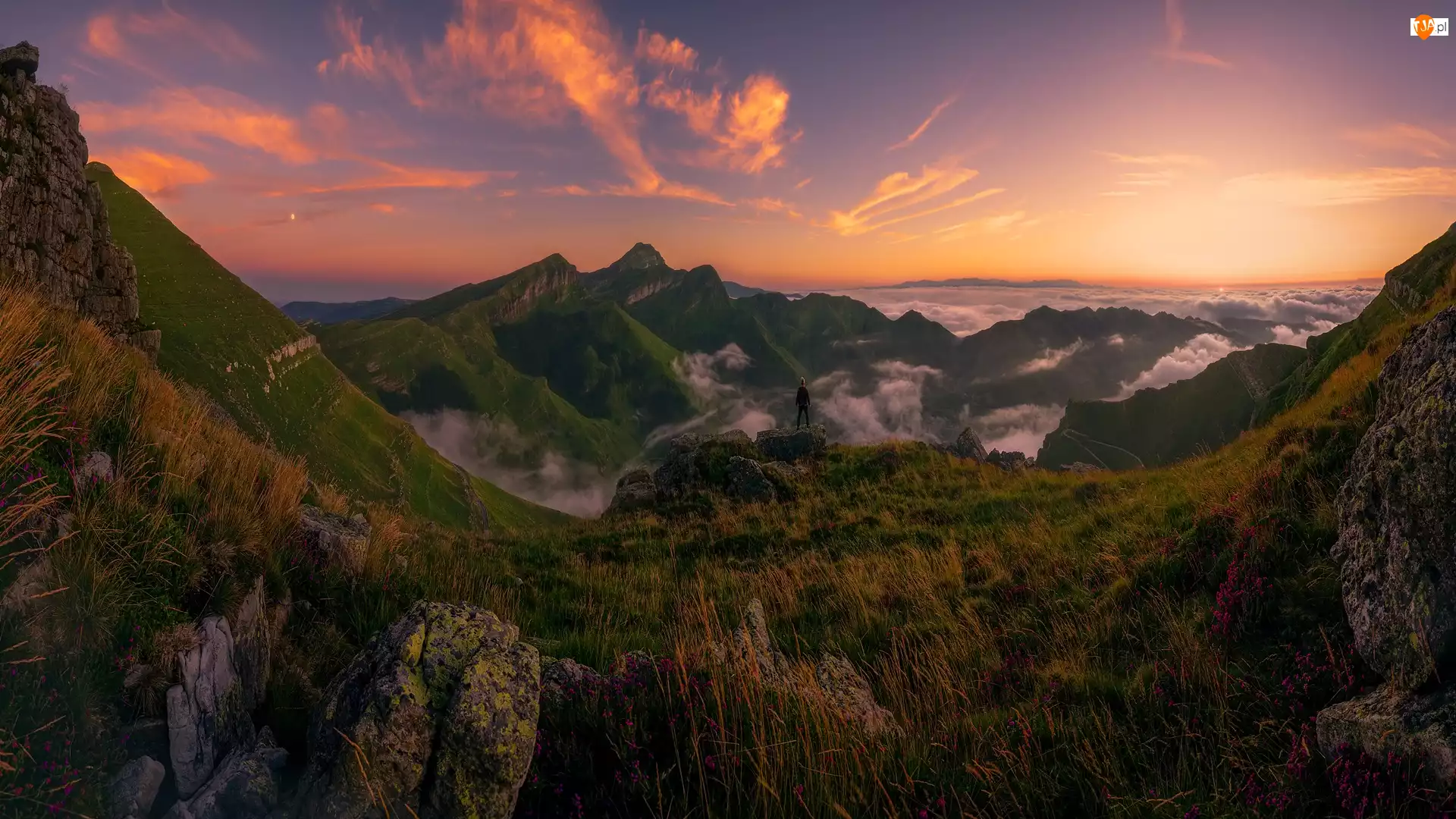 Wschód słońca, Hiszpania, Mgła, Góry Kantabryjskie, Człowiek