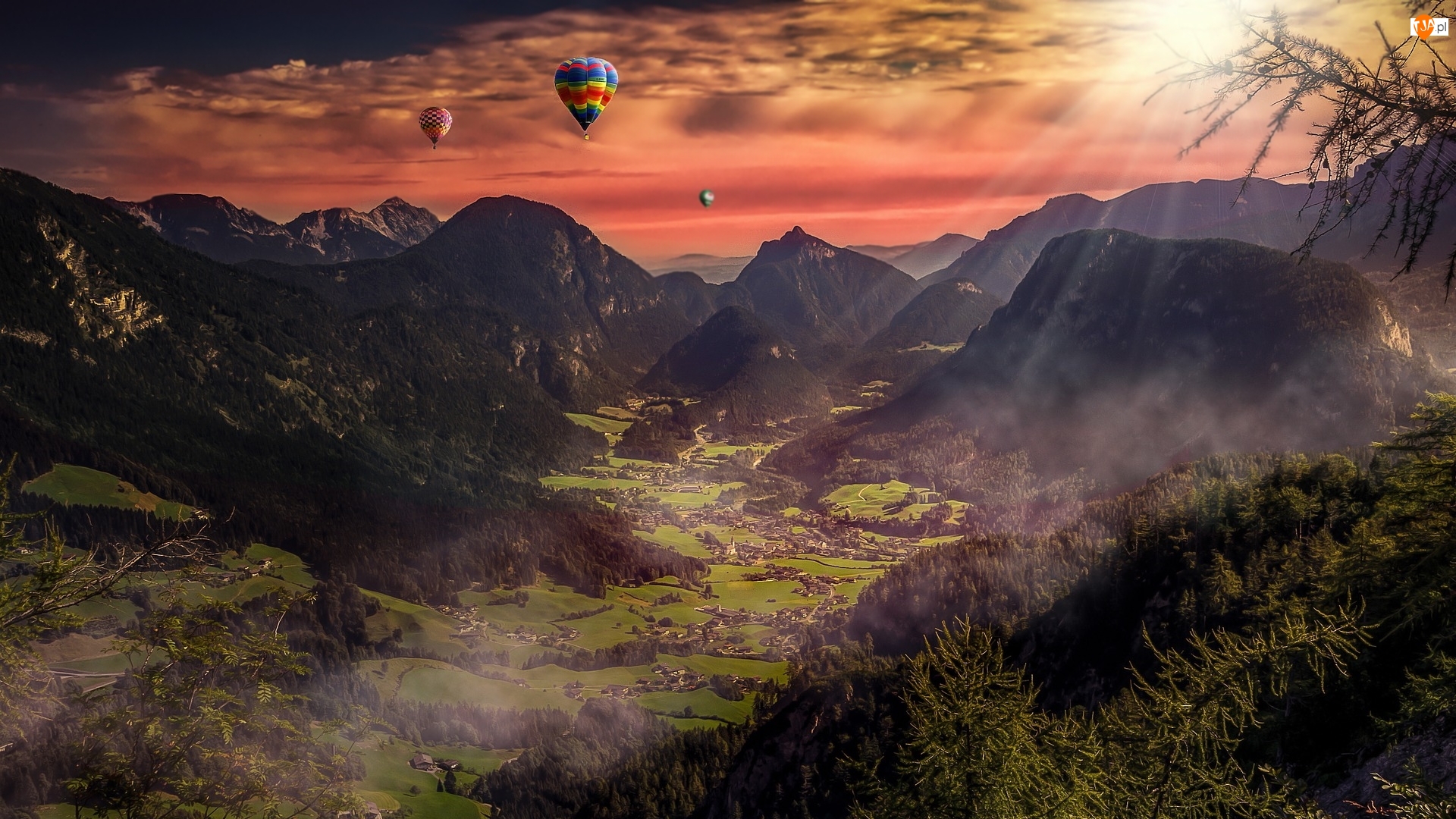 Dolina, Góry, Wschód słońca, Balony, Mgła, Kolorowe