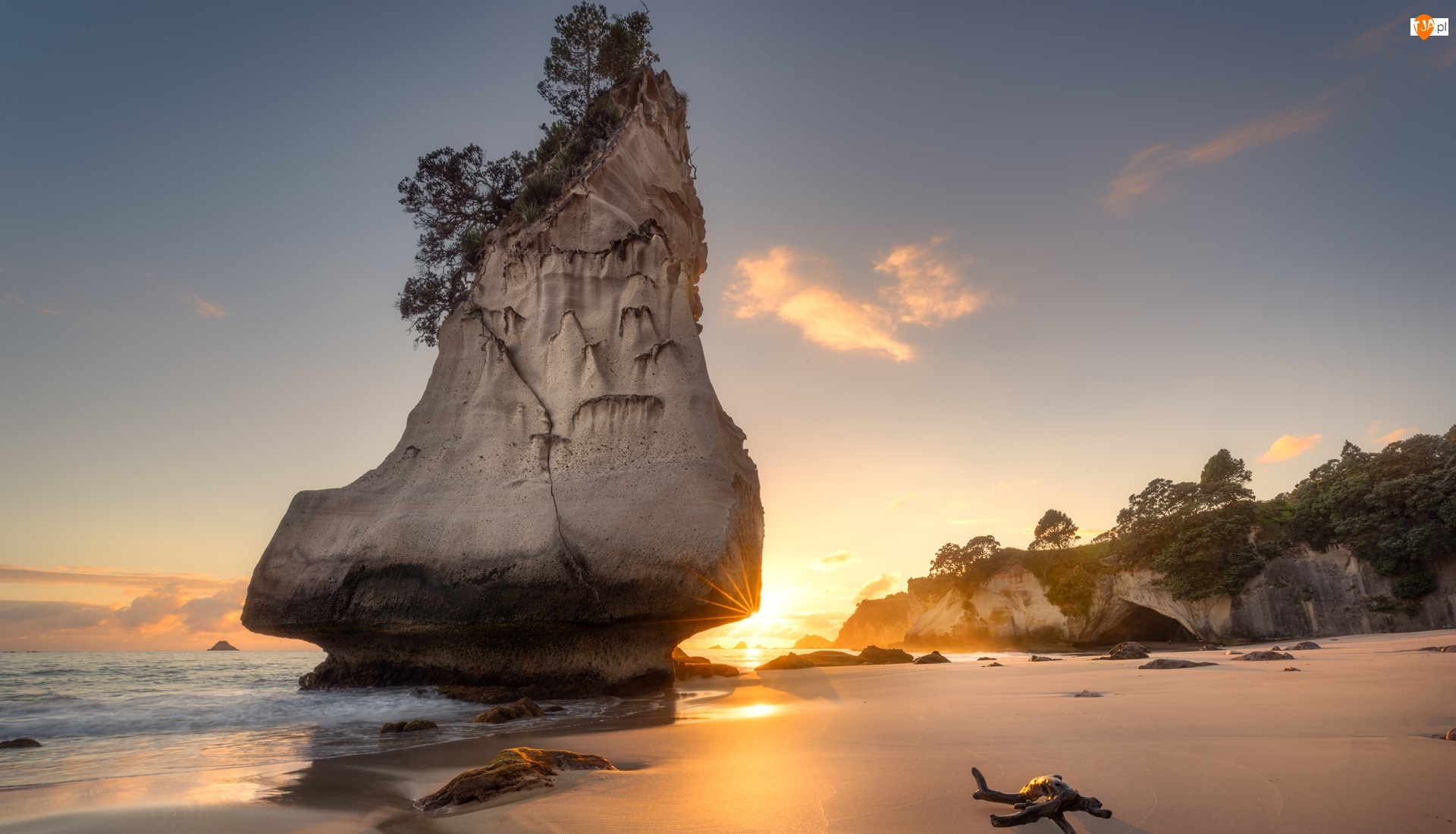 Wschód słońca, Morze, Plaża, Półwysep Coromandel, Skała, Drzewa, Nowa Zelandia, Te Hoho Rock