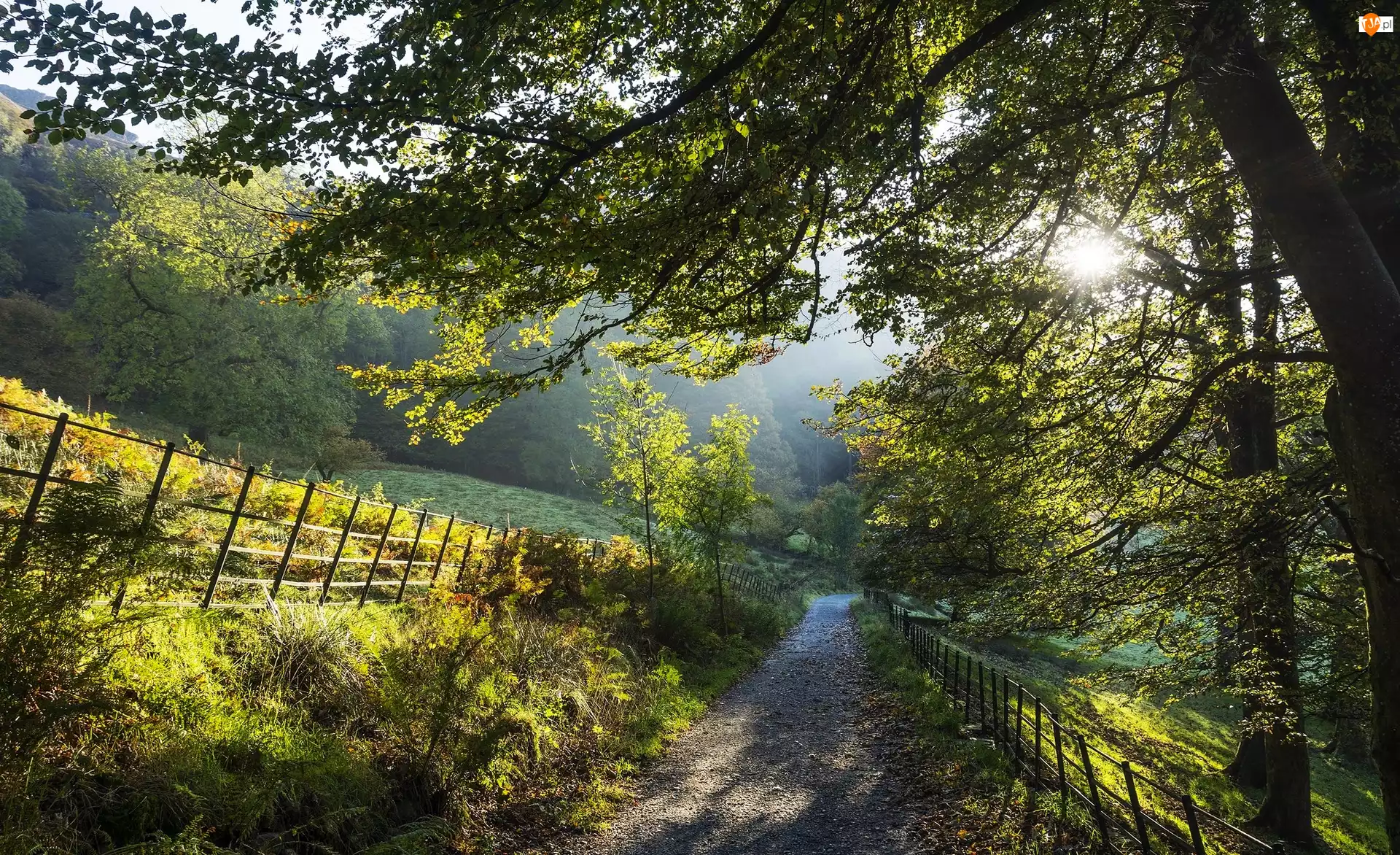 Ogrodzenie, Poranek, Płot, Droga, Drzewa