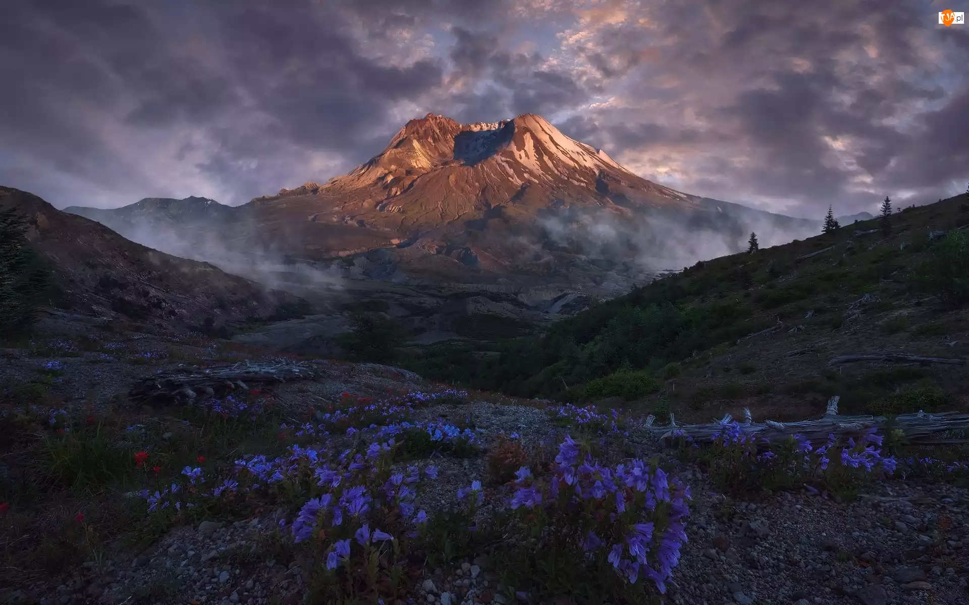 Mgła, Wschód słońca, Roślinność, Kwiaty, Góry, Łąka