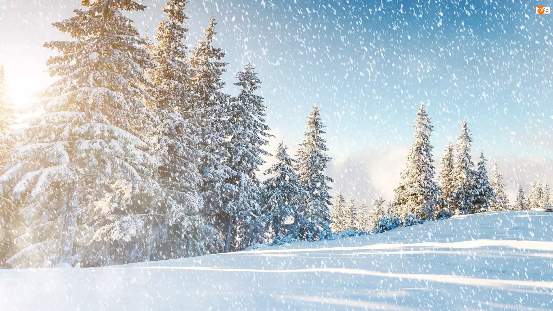 Śnieg, Świerki, Padający, Zima, Ośnieżone