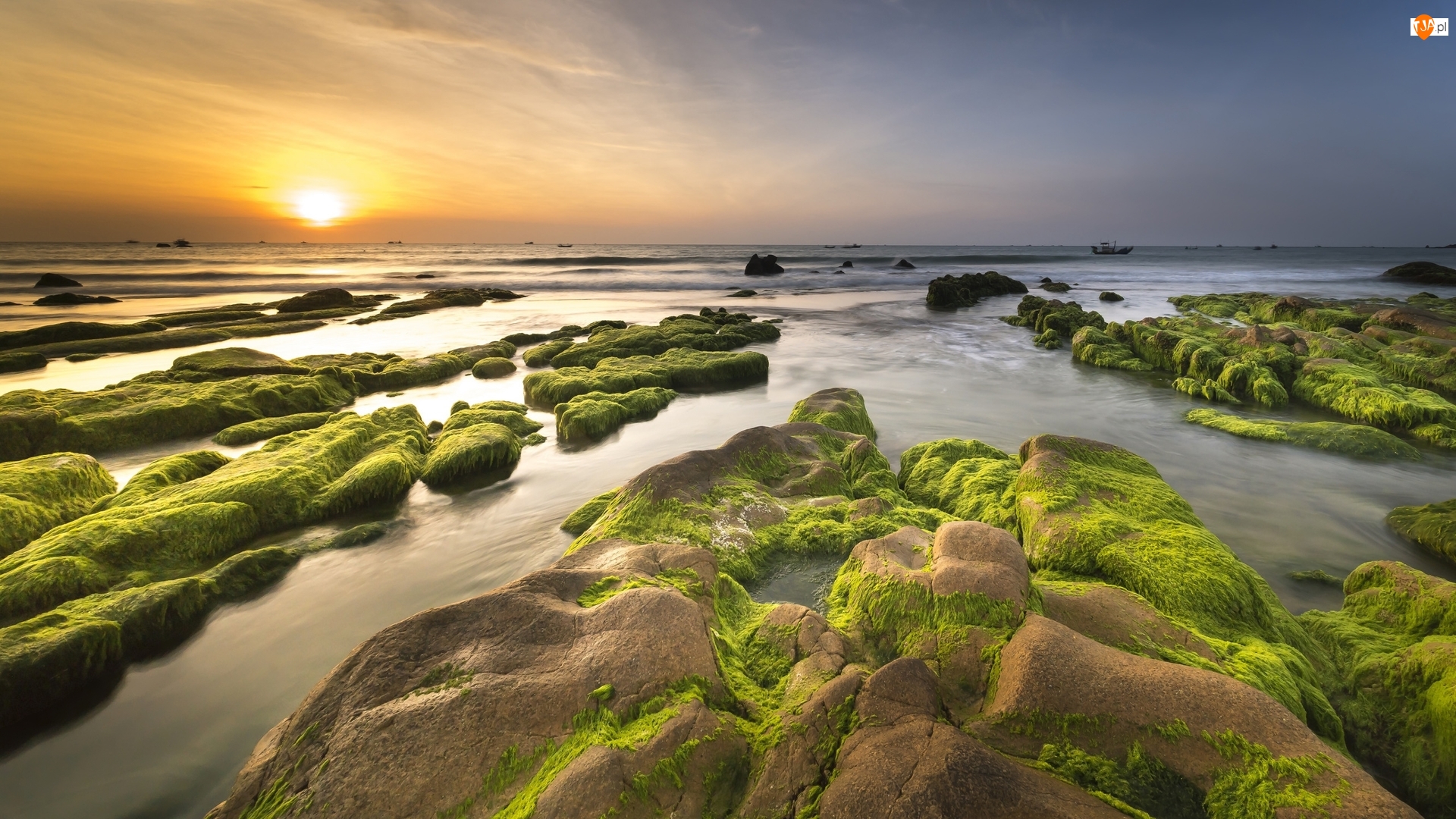 Skalisty, Wybrzeże, Omszałe, Wschód słońca, Brzeg, Skały