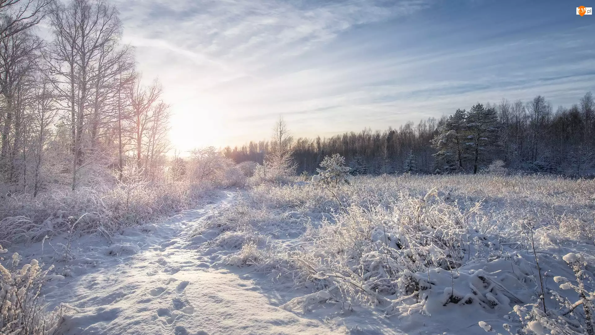 Las, Oszronione, Wschód słońca, Zima, Polana, Trawa, Drzewa