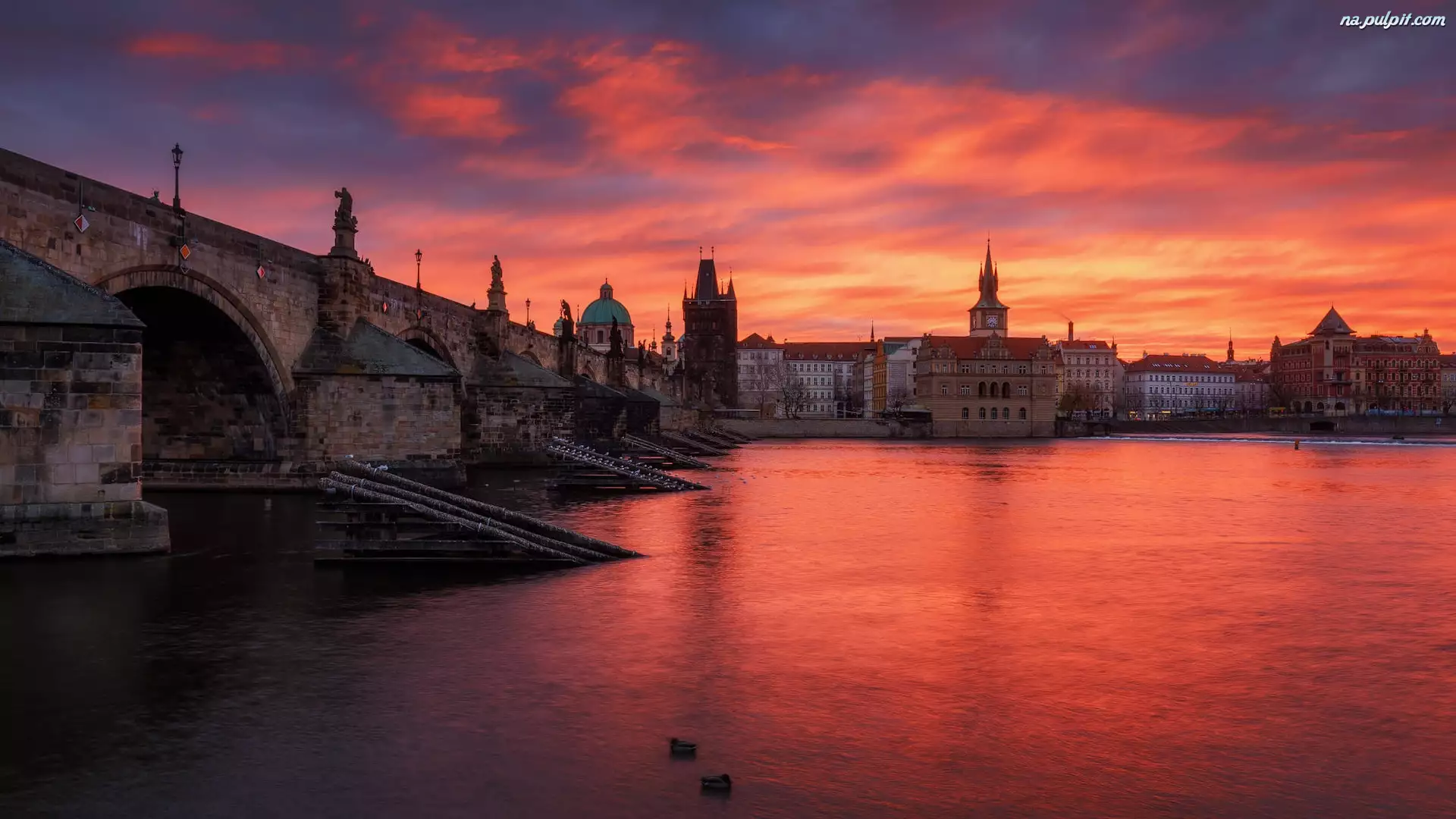 Praga, Czechy, Most Karola, Wschód słońca, Rzeka Wełtawa, Domy