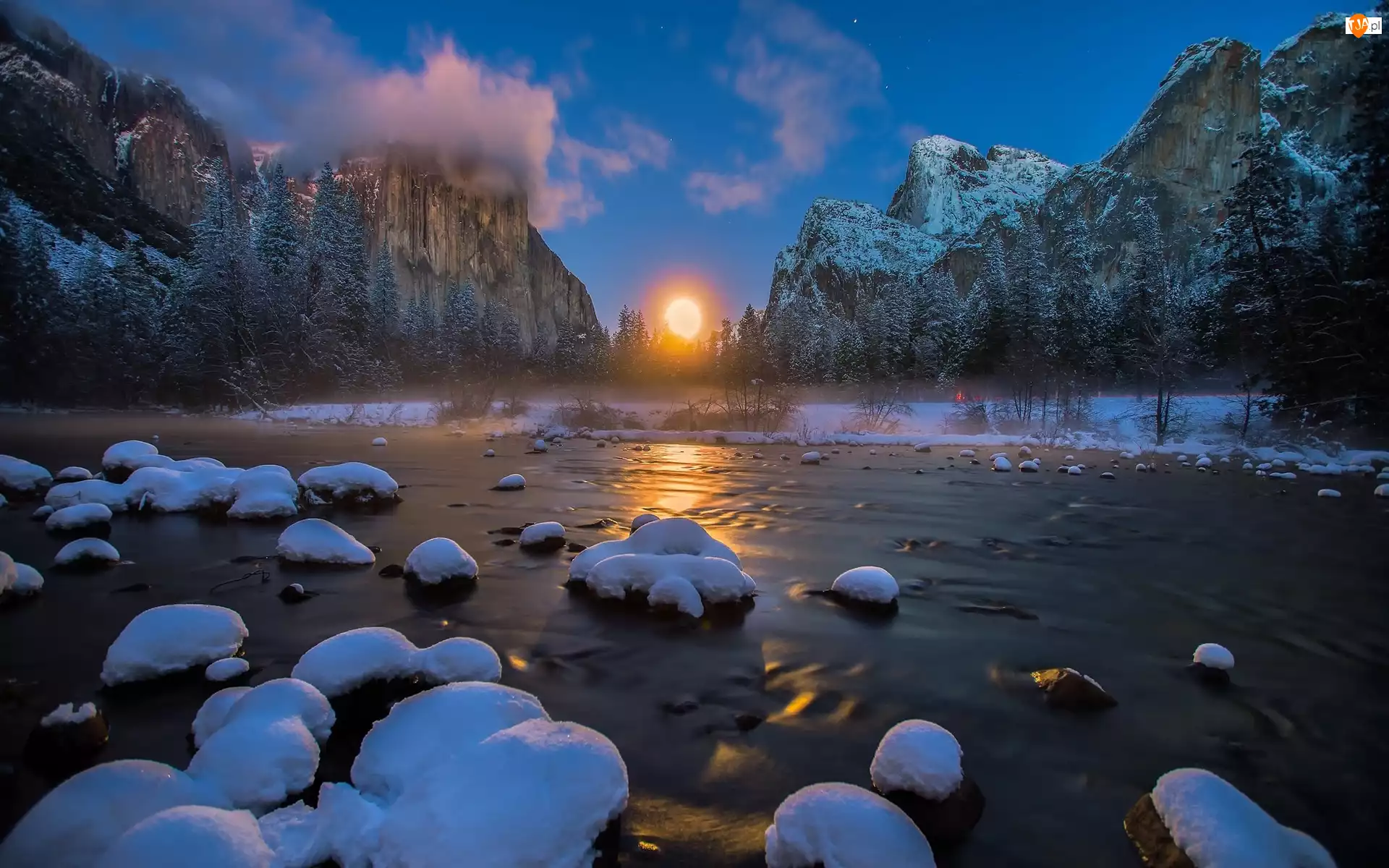 Wschód Słońca, Zima, Rzeka, Góry, Kamienie