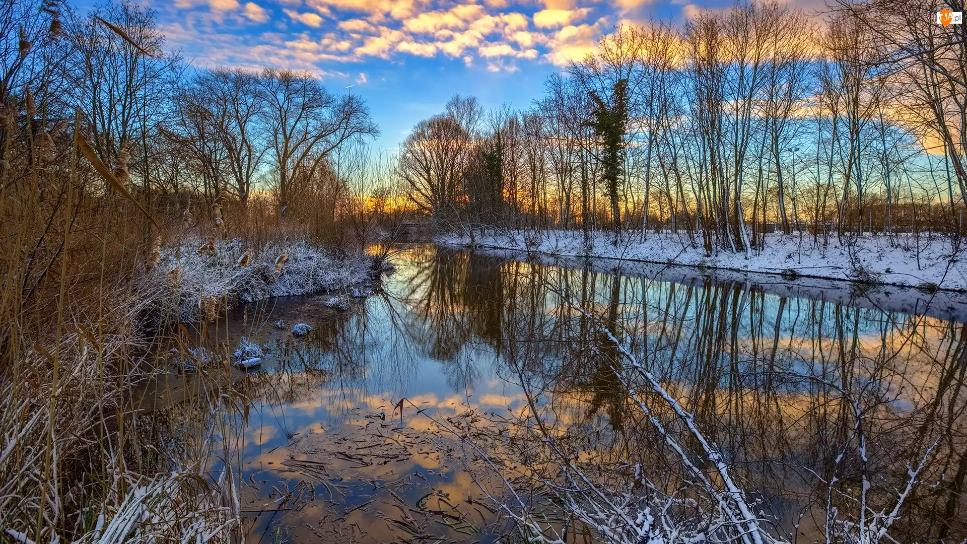 Drzewa, Wschód słońca, Zima, Odbicie, Rzeka, Trawy