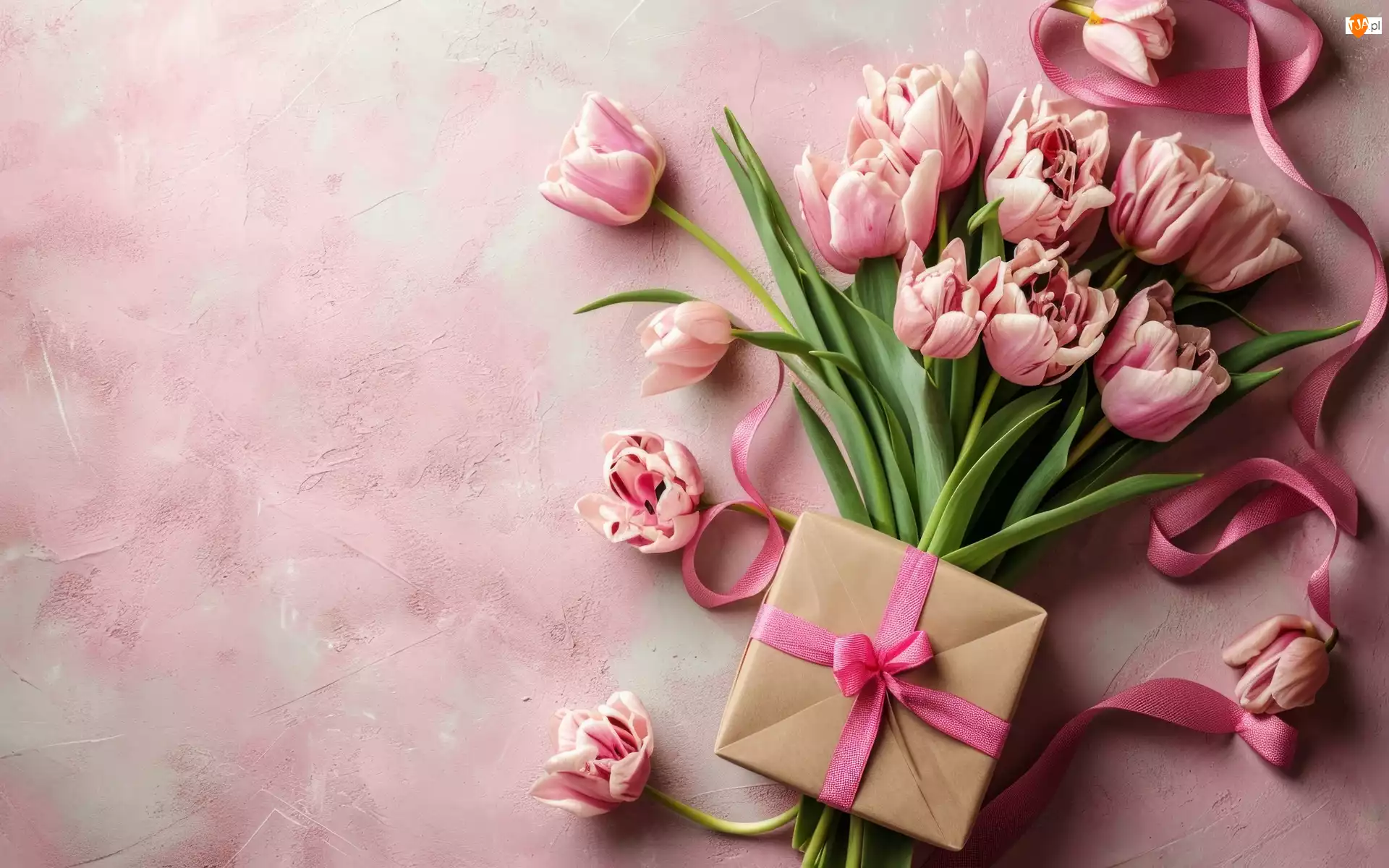 Wstążki, Różowe, Tulipany, Prezent