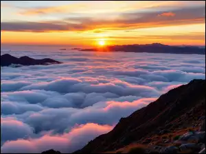 Opadająca, Kamienie, Góry, Wschód słońca, Mgła