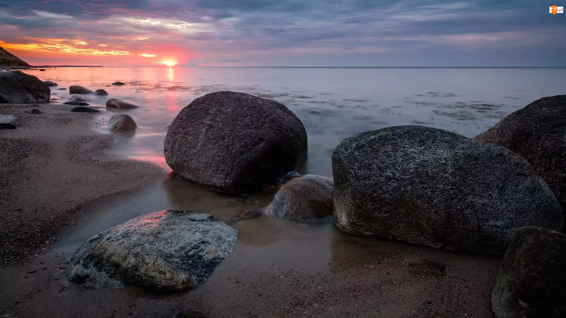 Zachód słońca, Wybrzeże, Piasek, Kamienie, Morze