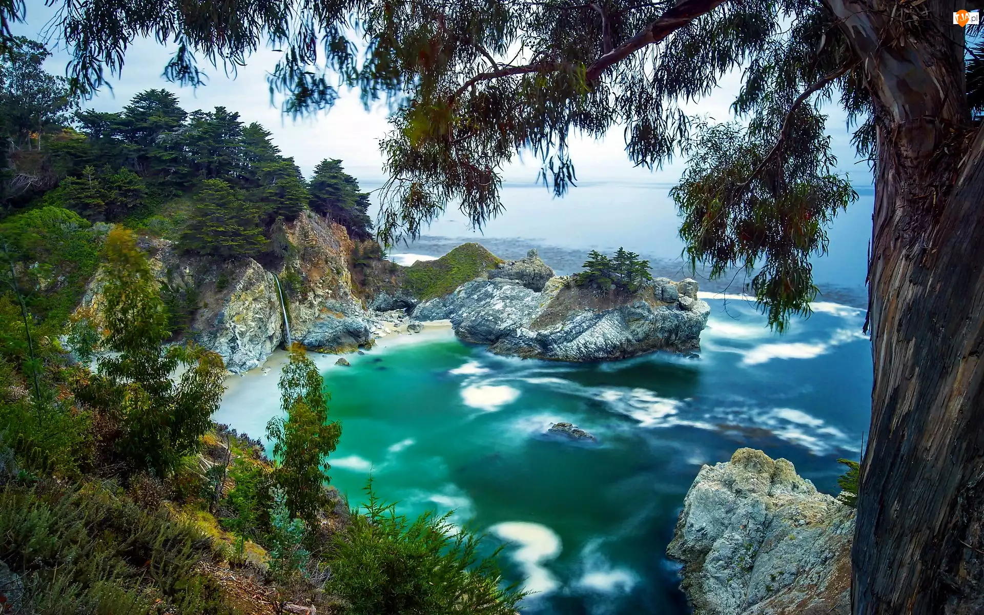 Wybrzeże, Wodospad, Ocean, Drzewo, Pacyfik, Skały