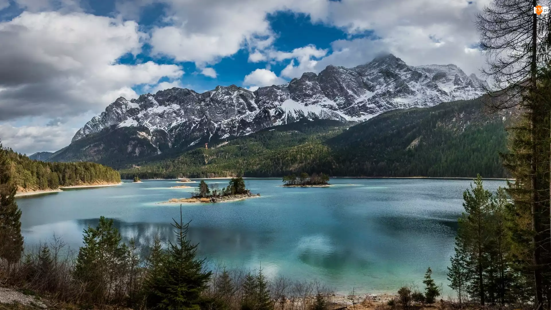 Drzewa, Chmury, Góry, Jezioro, Wysepki