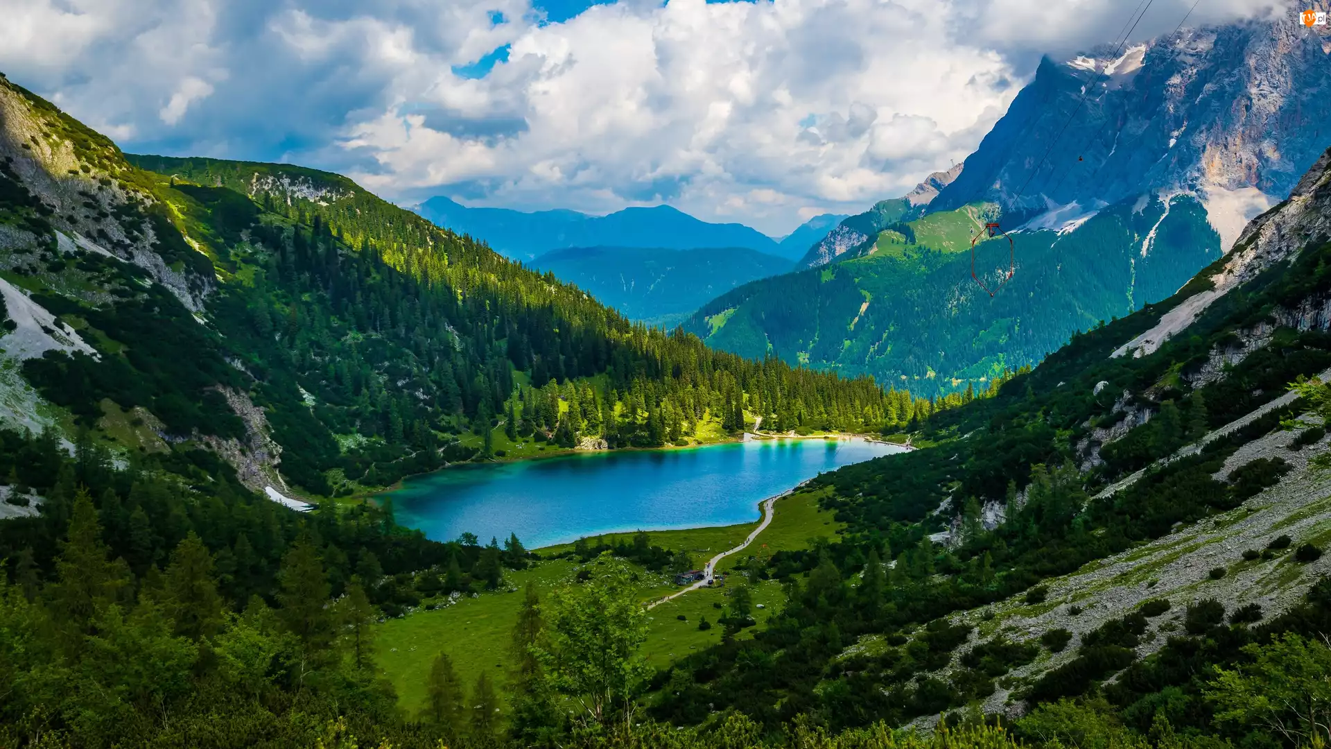 Austria, Chmury, Zieleń, Drzewa, Alpy, Góry, Seebensee, Jezioro, Lasy, Tyrol