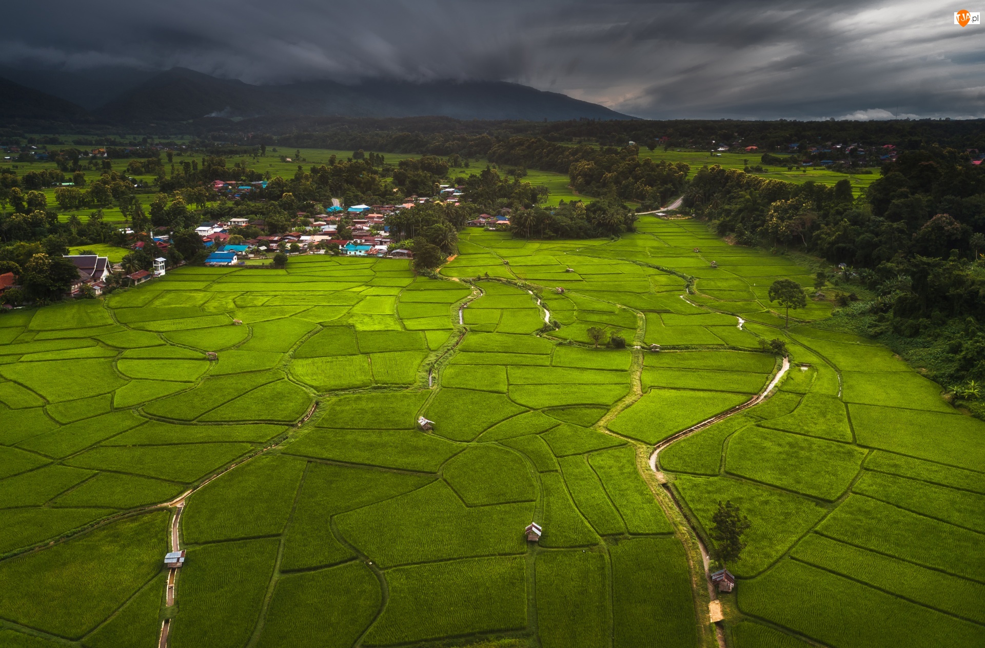 Drzewa, Domy, Góry, Chmury, Pola uprawne, Ciemne