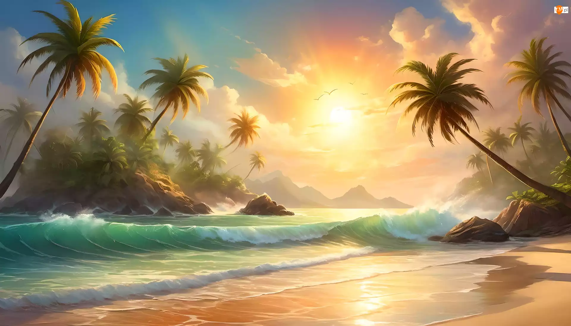 Wyspy, Morze, Grafika, Palmy, Zachód słońca, Ch