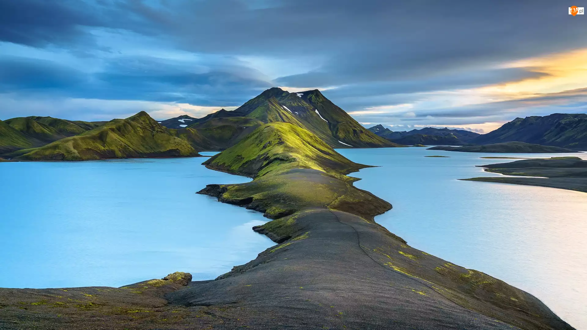 Wzgórza, Chmury, Góry, Islandia, Morze