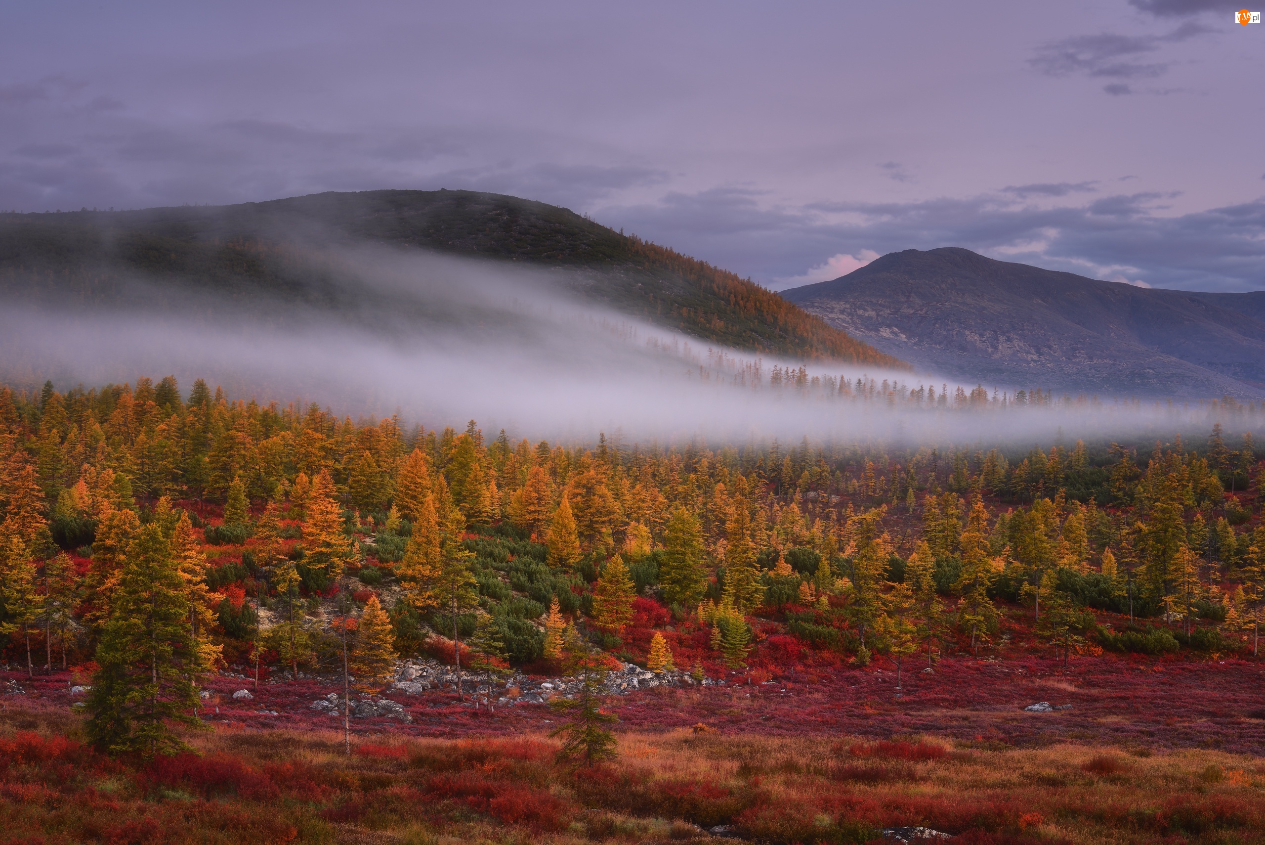 Kołyma, Góry, Mgła, Obwód magadański, Drzewa, Jesień, Rosja, Wzgórza