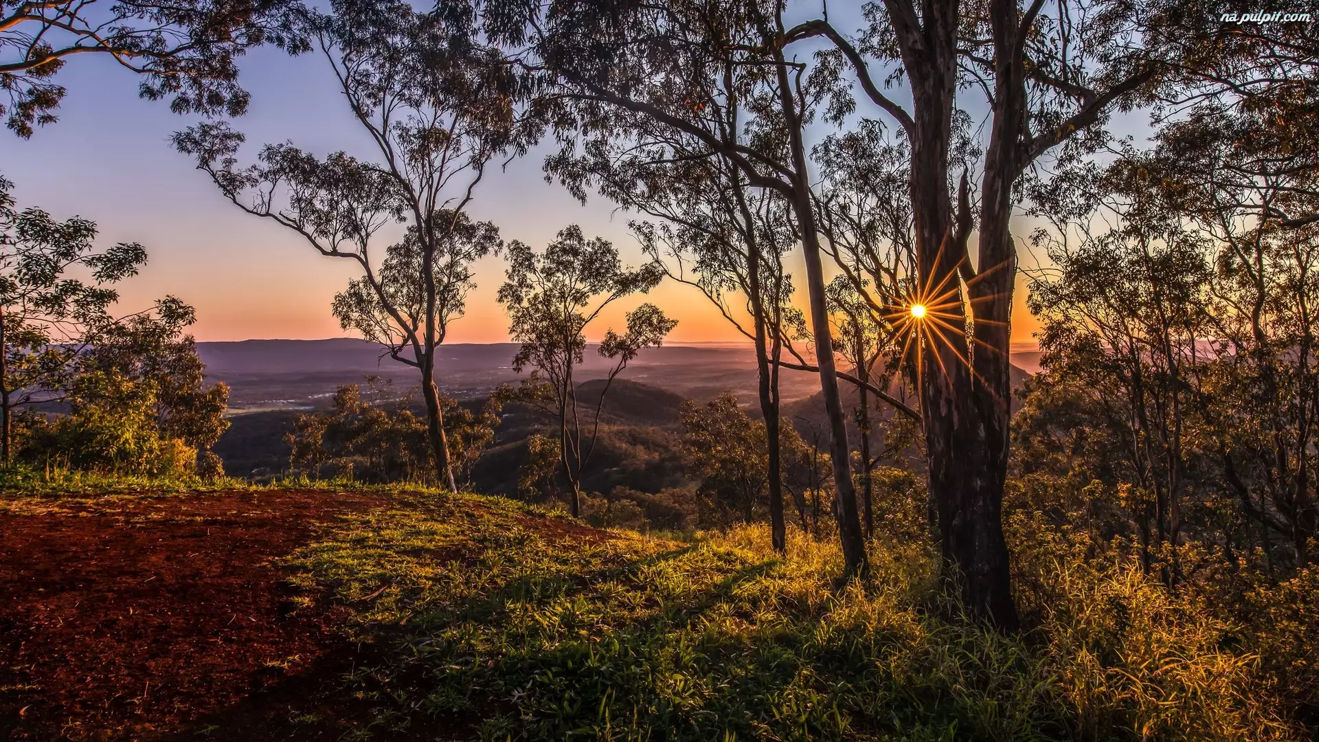 Wzgórza, Krajobraz, Drzewa, Promienie słońca
