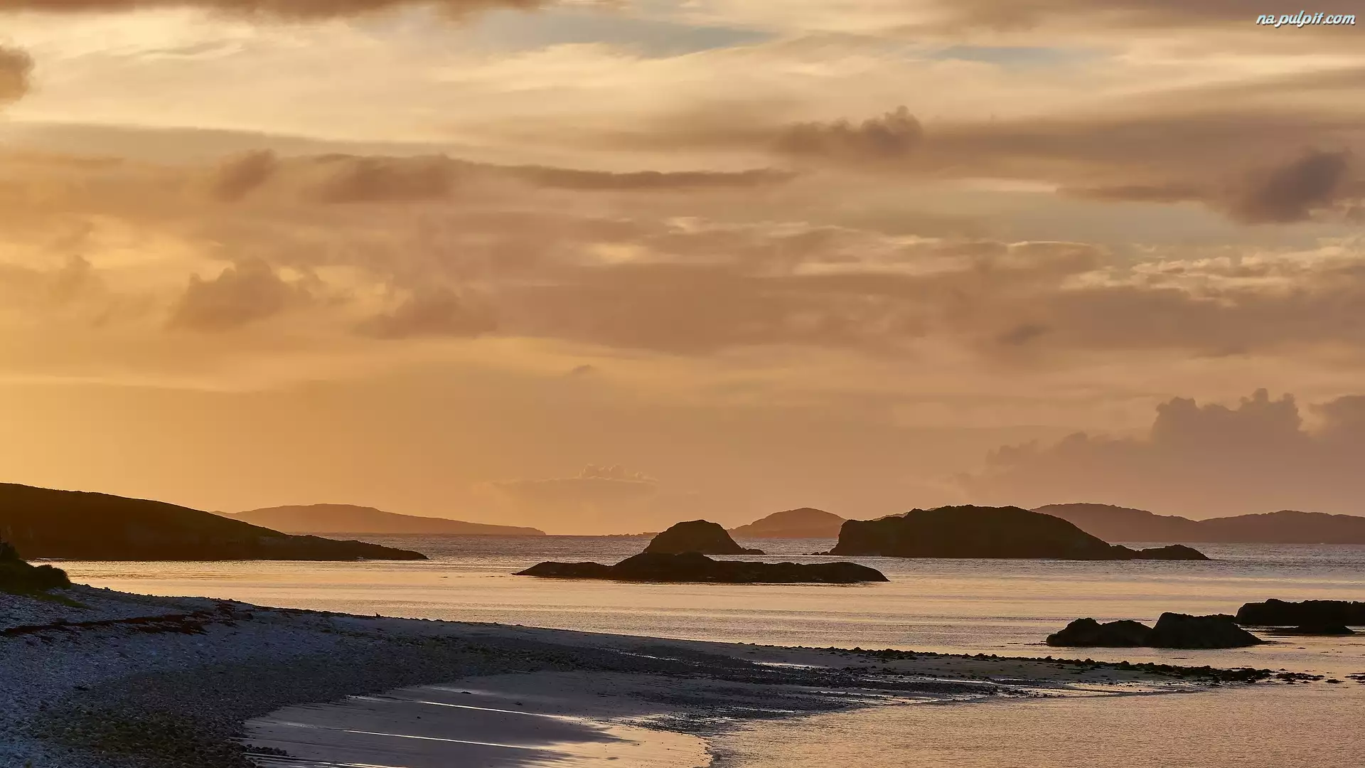 Morze, Zachód słońca, Wzgórza, Chmury, Skały, Wybrzeże