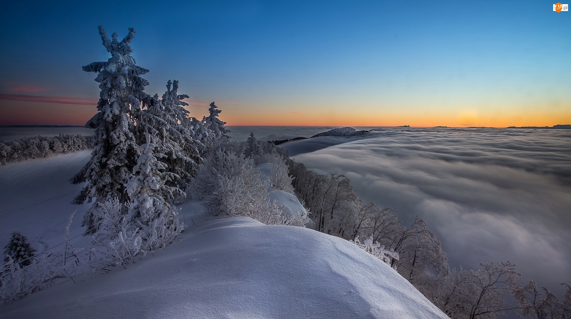 Mgła, Zima, Drzewa, Wzgórze, Śnieg