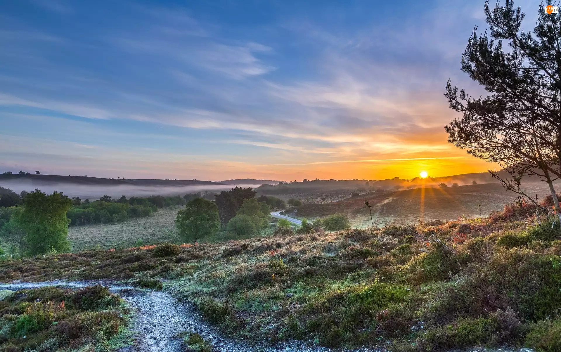 Wzgórza, Wschód słońca, Anglia, Drzewa, Park Narodowy New Forest, Mgła