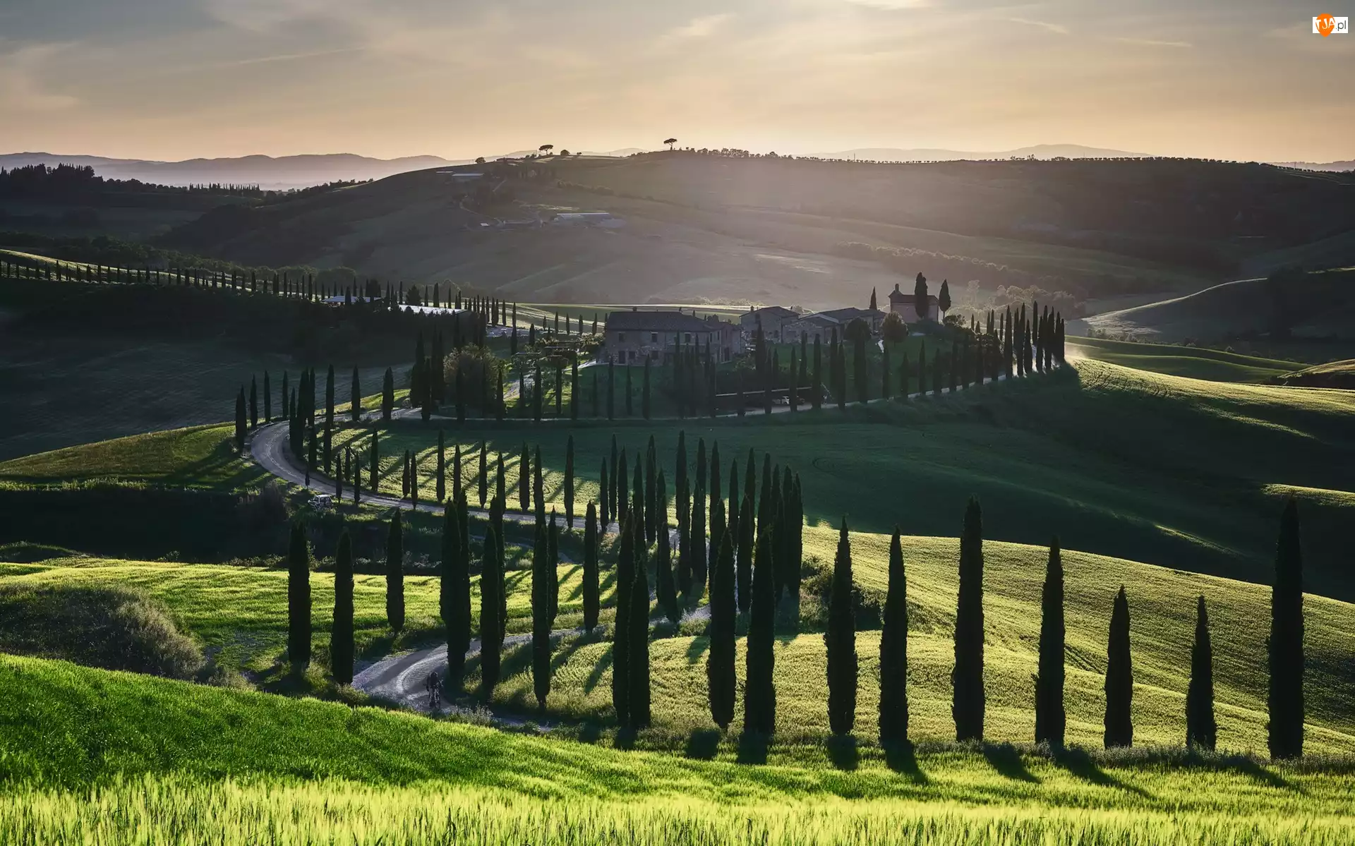 Wzgórza, Włochy, Cyprysy, Droga, Drzewa, Hotel,