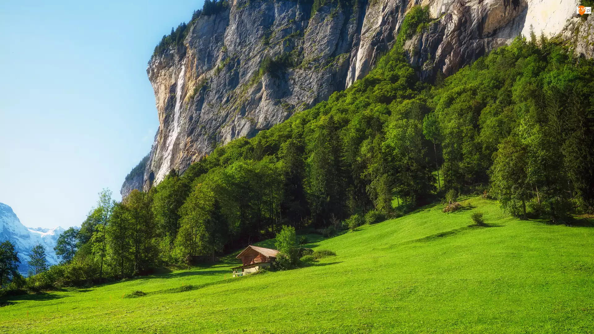 Wzgórze, Góry, Szwajcaria, Polana, Dolina Lauterbrunnen, Drzewa, Dom