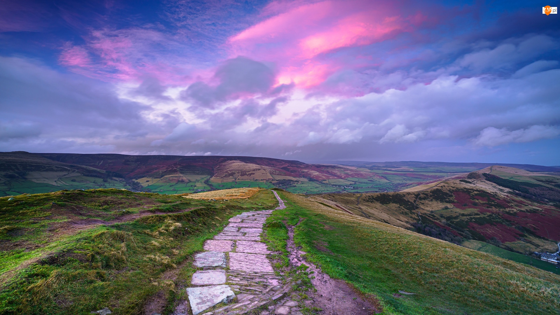 Droga, Niebo, Anglia, Wzgórze Mam Tor, Derbyshire, Wyżyna Peak District, Chmury