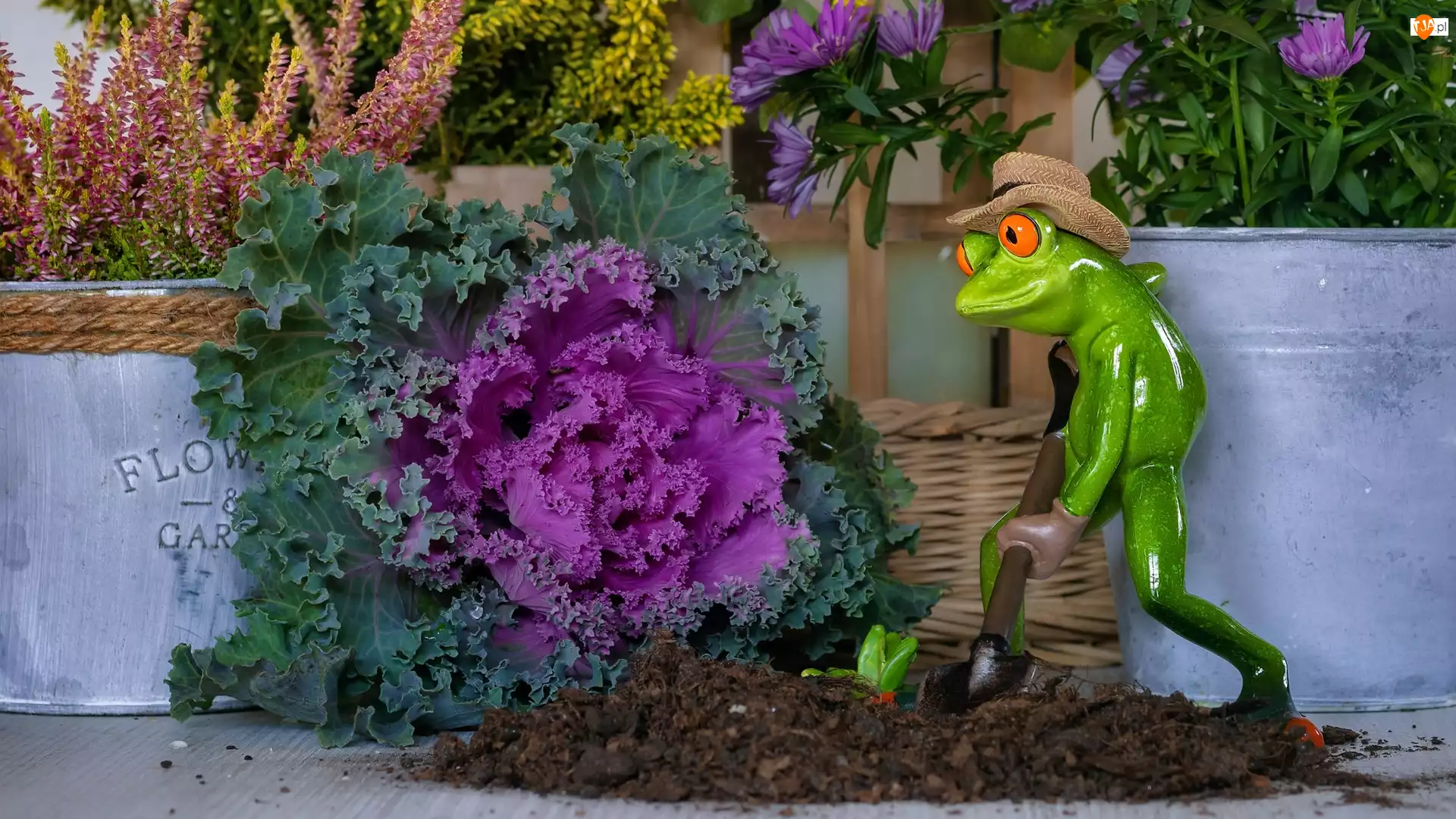Żabka, Figurka, Doniczki, Kapusta ozdobna, Ogród, Ziemia