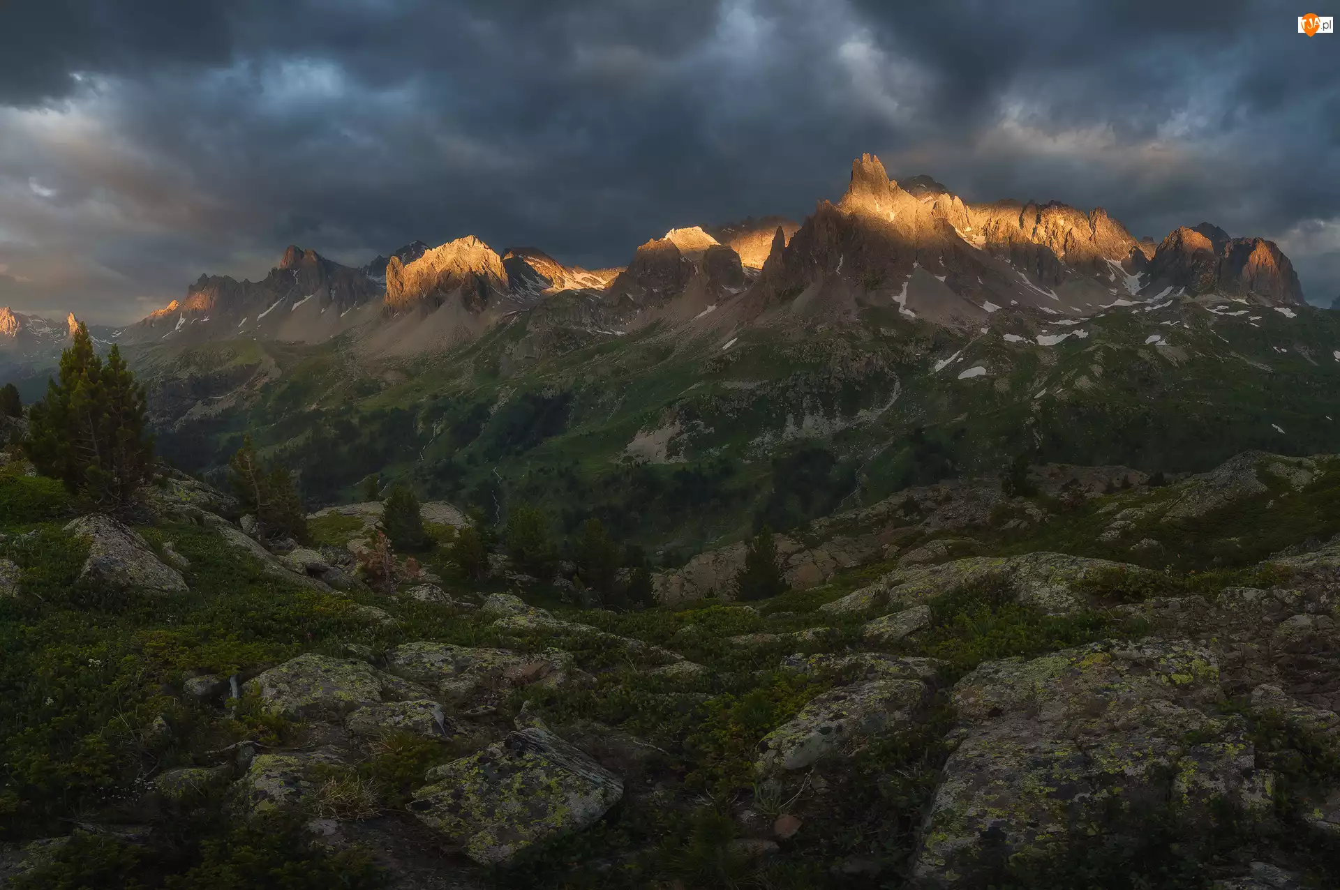 Alpy, Rozświetlone, Francja, Góry, Niebo, Pochmurne, Szczyty