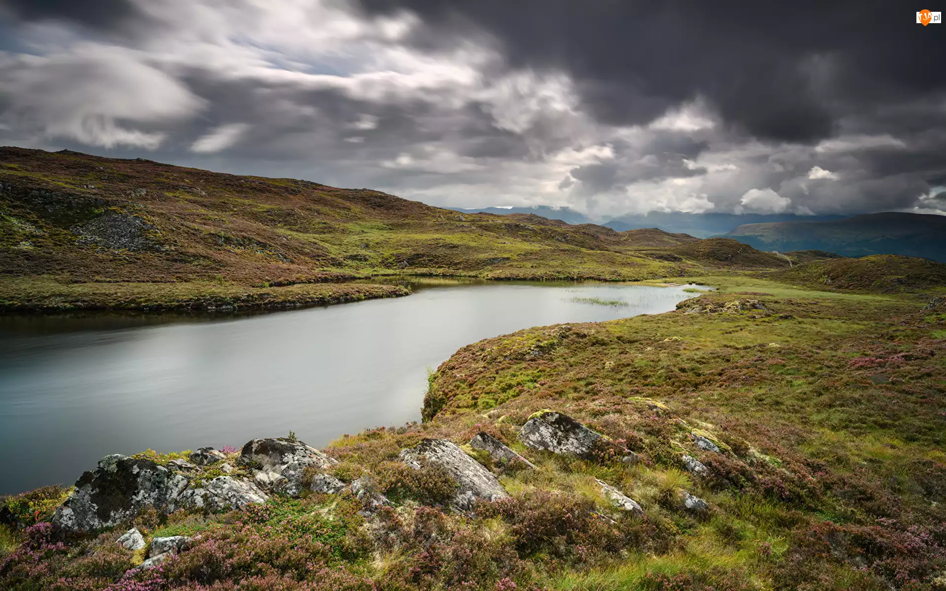 Rzeka, Góry, Trawa, Niebo, Kamienie, Zachmurzone