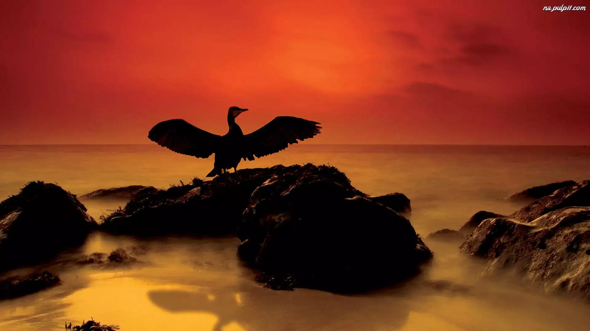 Zachód, Ocean, Kormoran, Mgła, Kamienie, Słońc