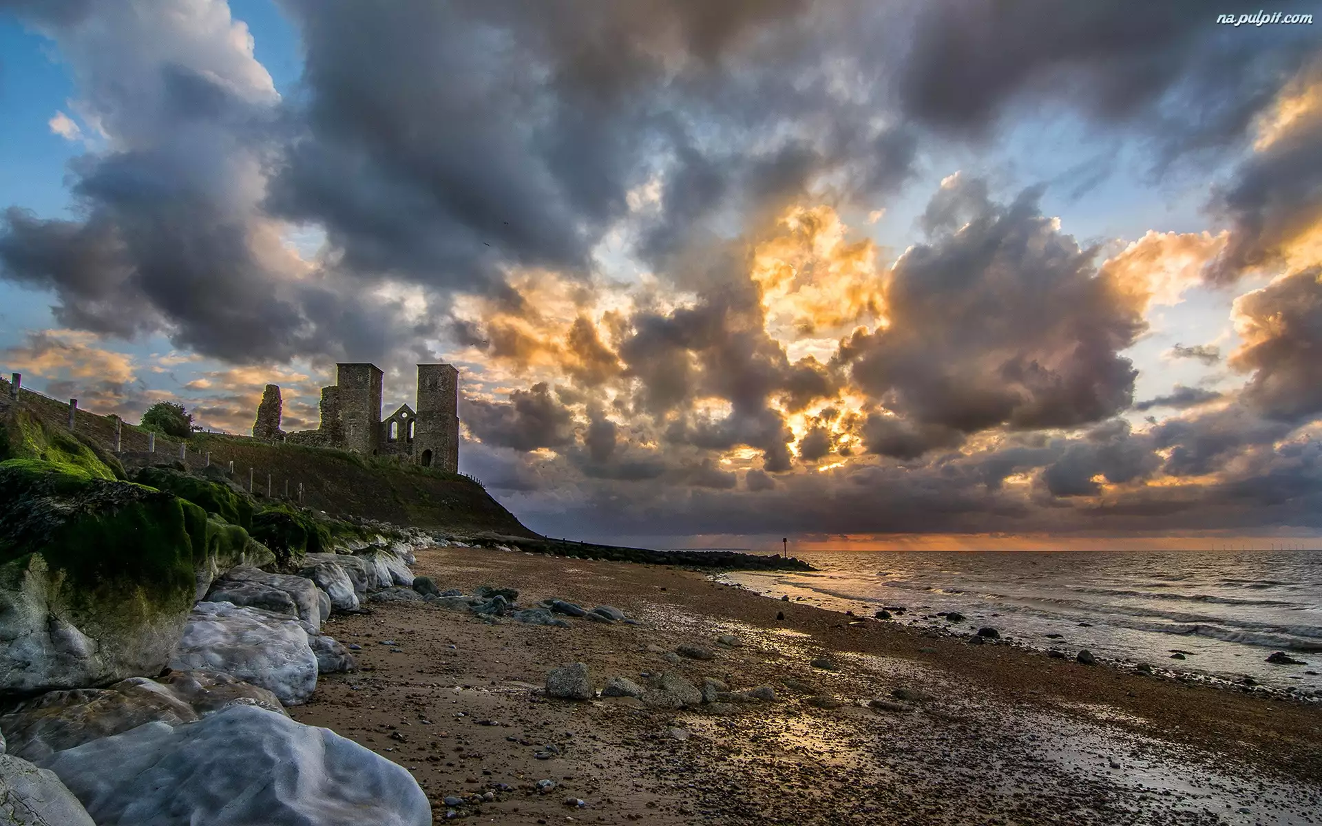 Zachód, Ruiny, Plaża, Morze, Słońca, Kamienie, Chmury