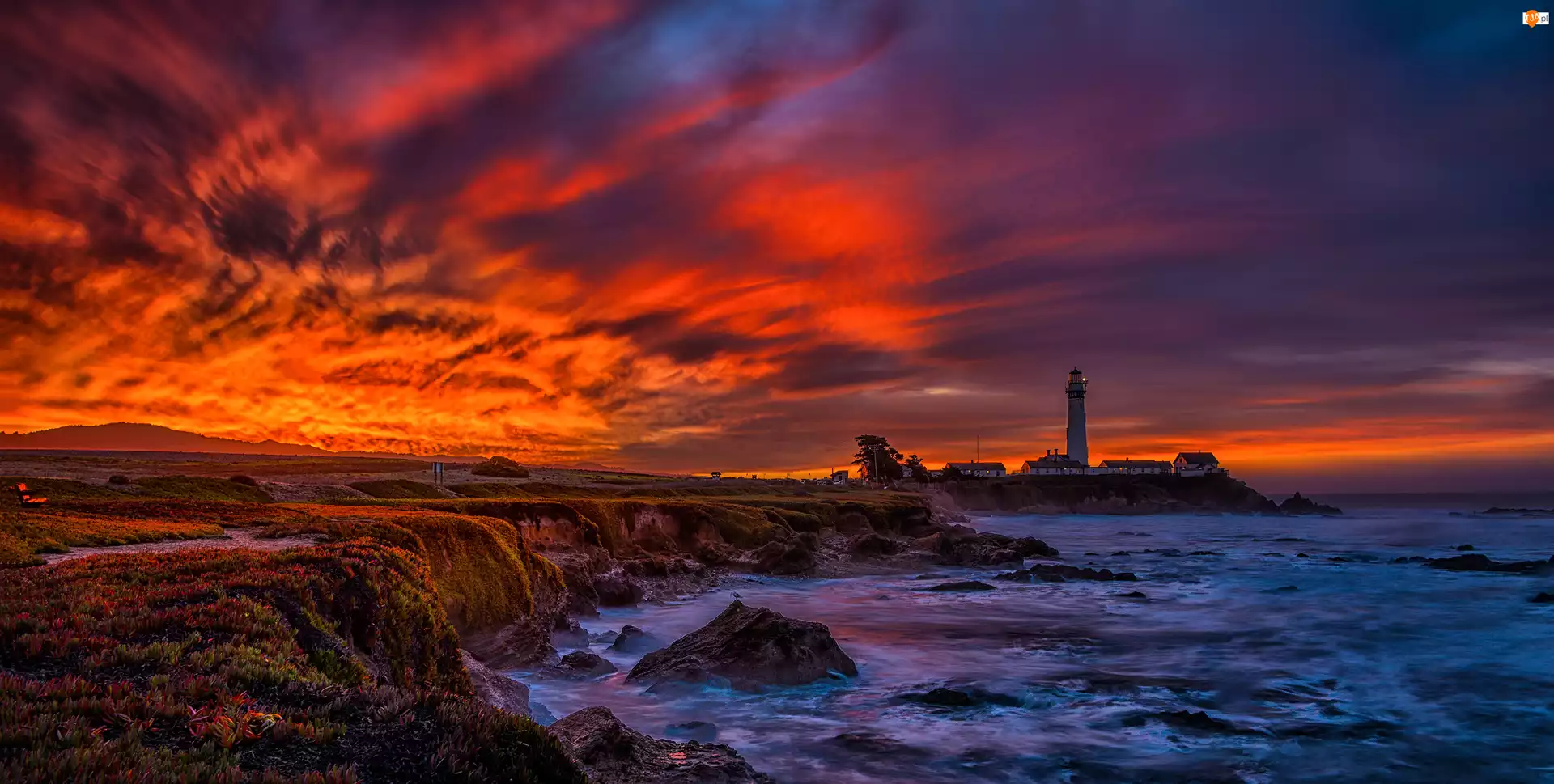 Zachód, Skały, Latarnia, Wybrzeże, Słońca, Morska, Chmury