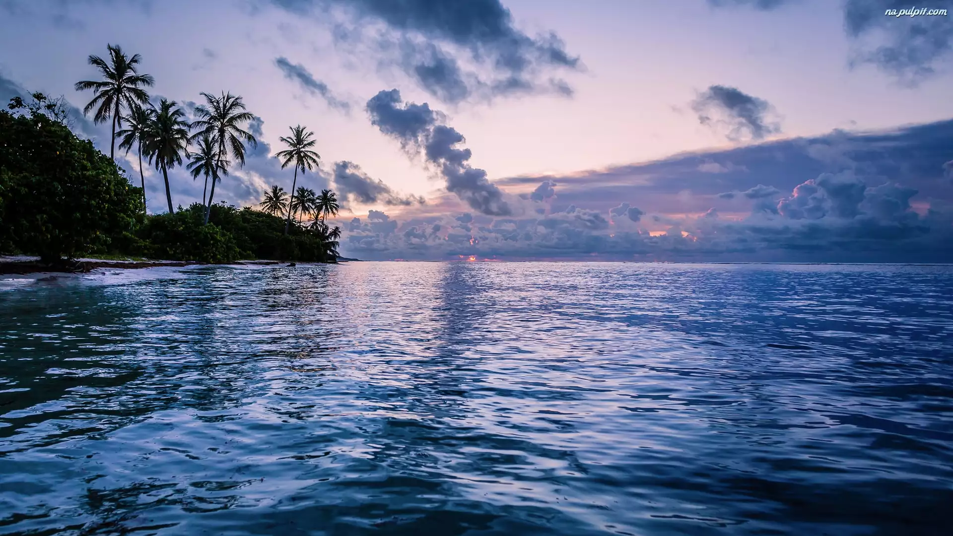 Zachód słońca, Chmury, Drzewa, Palmy, Morze