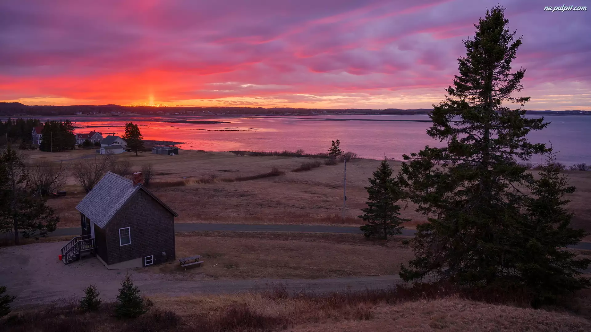 Zachód słońca, Domy, Stany Zjednoczone, Jezioro, Stan Maine, South Lubec, Drzewa