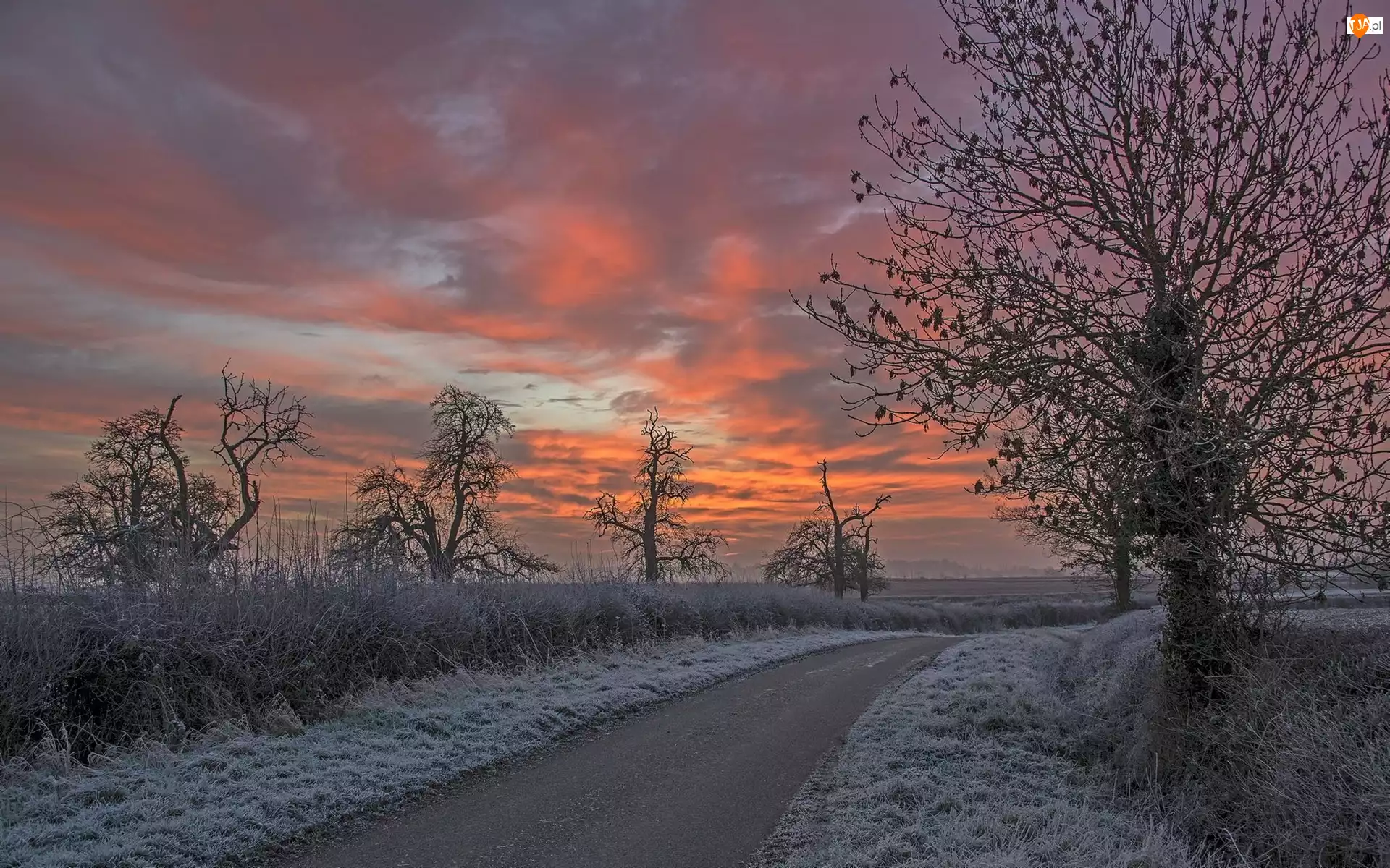 Zachód Słońca, Droga, Krzewy, Drzewa, Szron