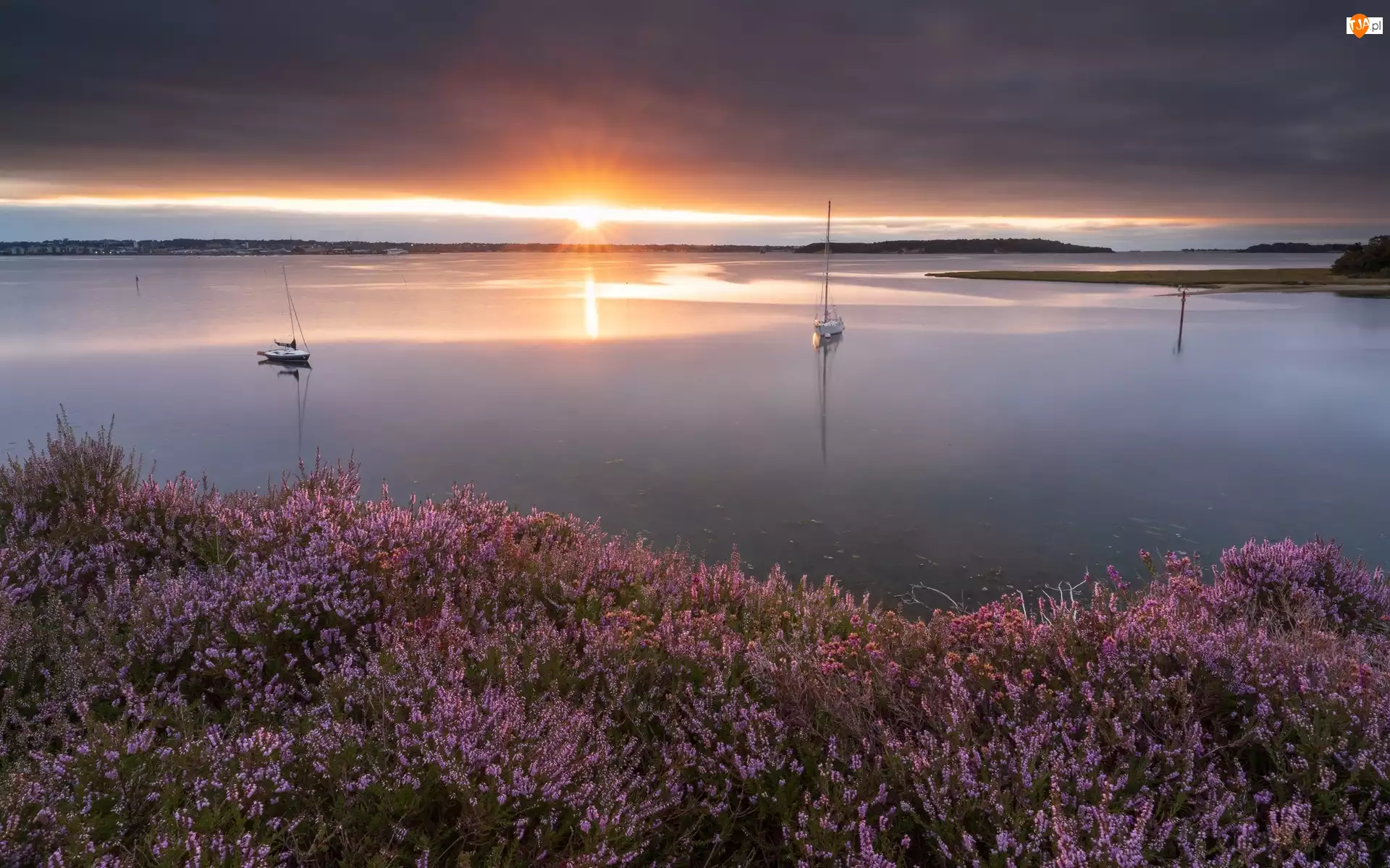 Zachód słońca, Jezioro, Żaglówki, Roślinność